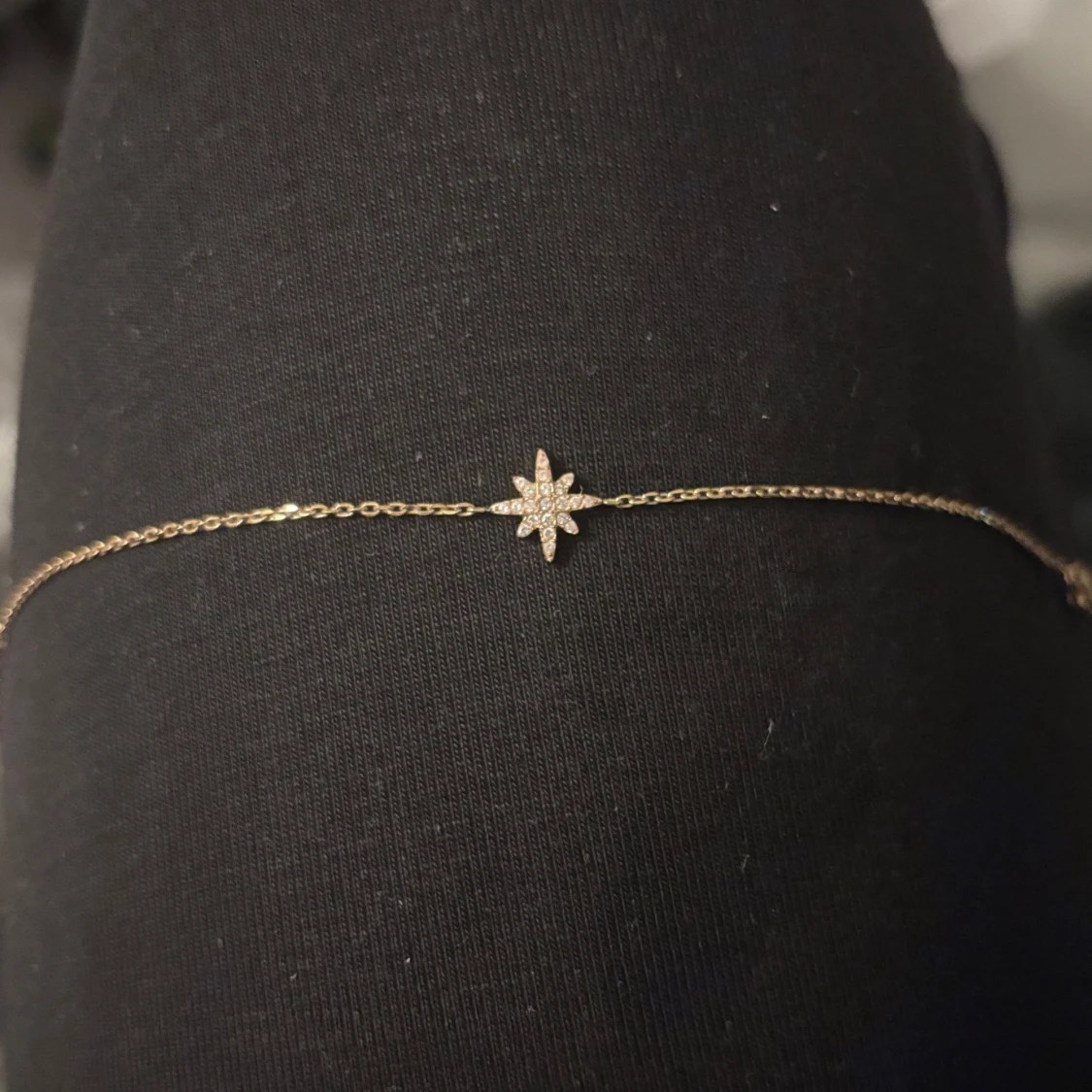 Superfint tunt armband i guld med en gnistrande stjärnformad detalj i mitten, dekorerad med små glittrande stenar. Perfekt för dig som gillar stilrena smycken med lite extra bling. Kedjan är tunn och smidig, vilket gör armbandet lätt att bära varje dag.