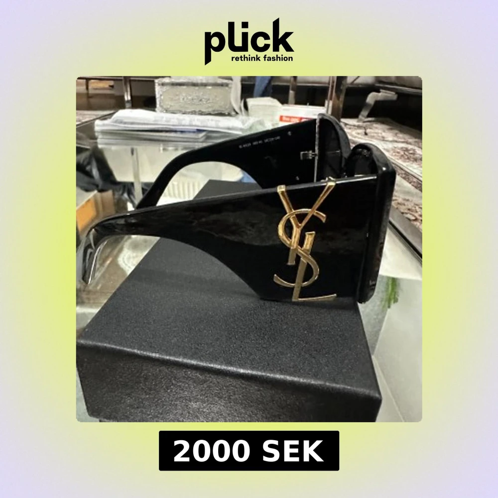 Snygga svarta solglasögon från Saint Laurent med breda skalmar och ikoniska YSL-loggor i guld på sidorna. Glasögonen har en fyrkantig form och näskuddar i guld med YSL-detalj. Kommer med originalfodral och putsduk.