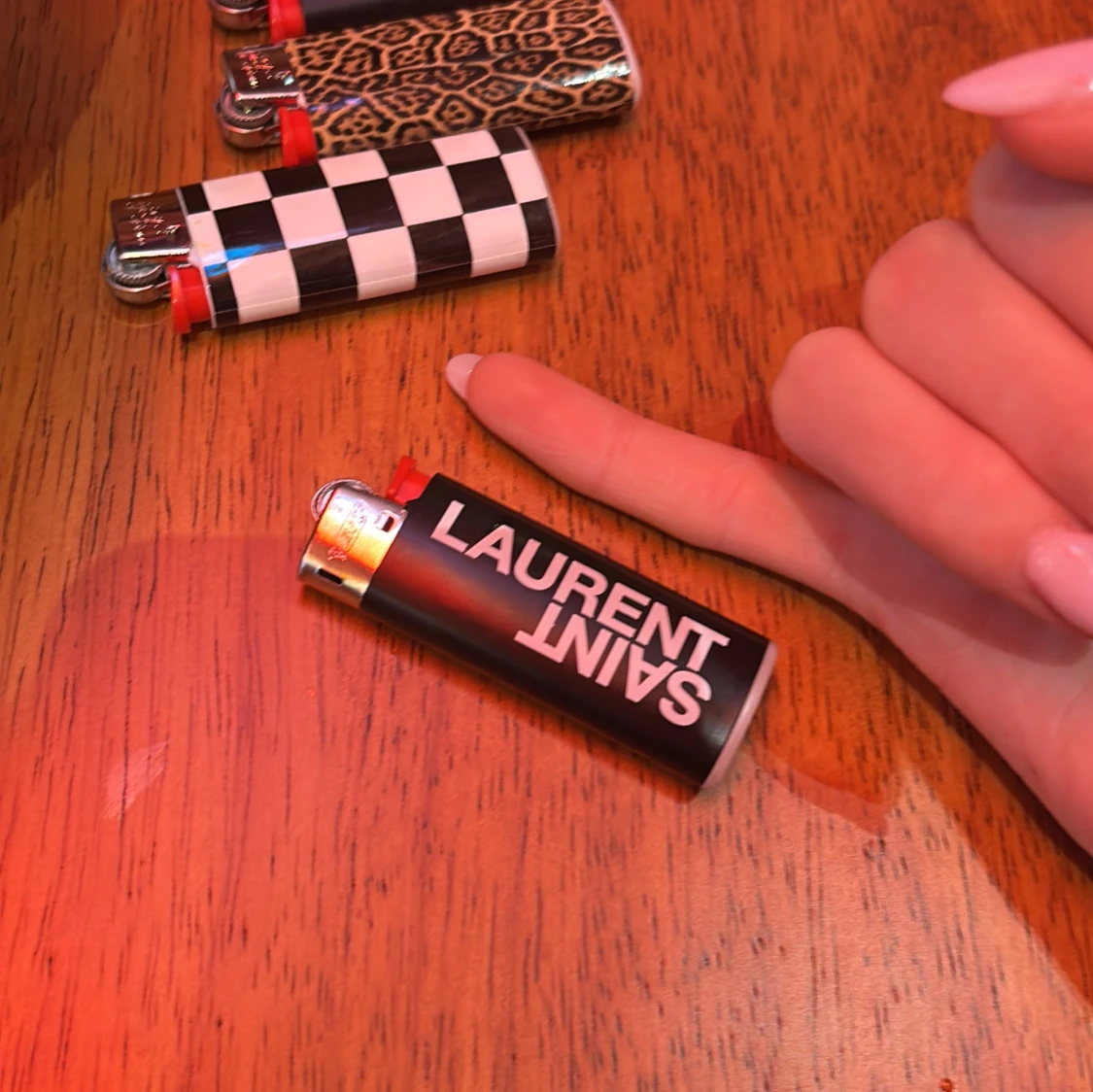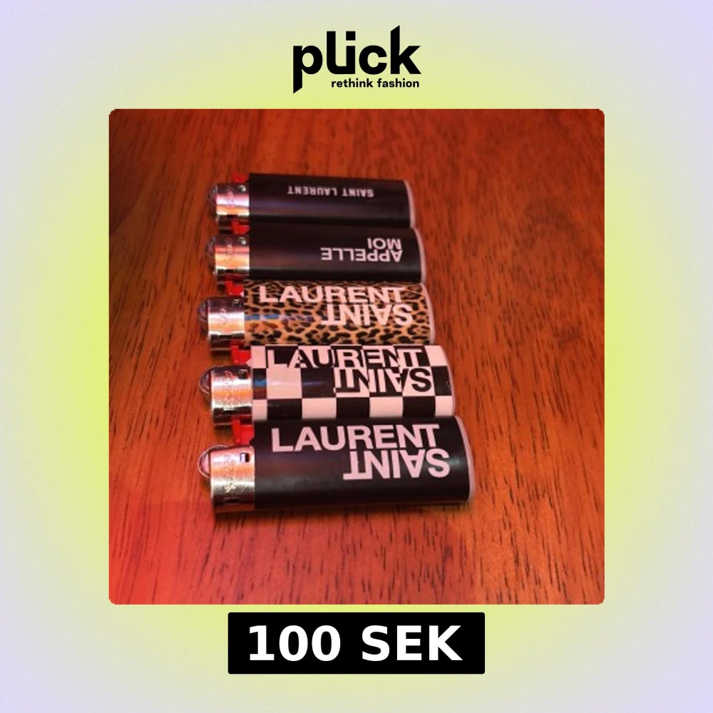 Snyggt set med 5 Saint Laurent Paris tändare i olika designer: svart, rutigt, leopard och med text. Alla i jätte fint skick köpt för 10 minuter sedan säljes för 100 st. Köpare står för frakten