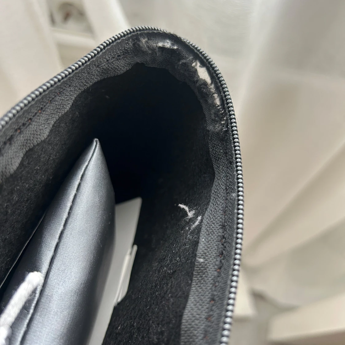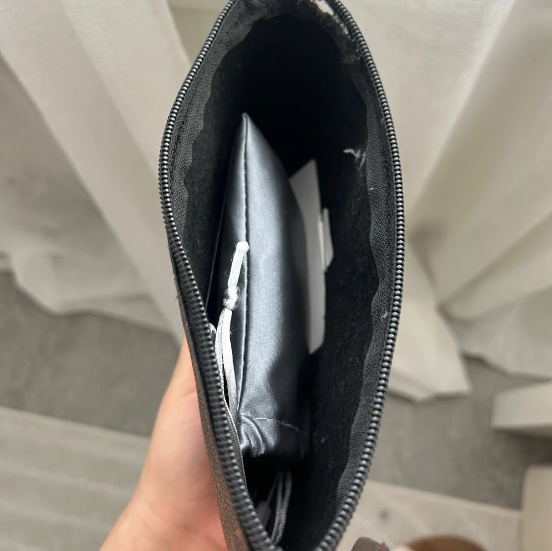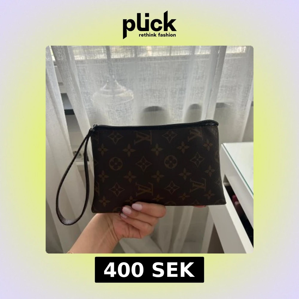 Säljer en brun kuvertväska från med klassiskt monogrammönster och handledsrem. Väskan har dragkedja upptill och är tillverkad i skinn. Perfekt för att bära det viktigaste med stil.