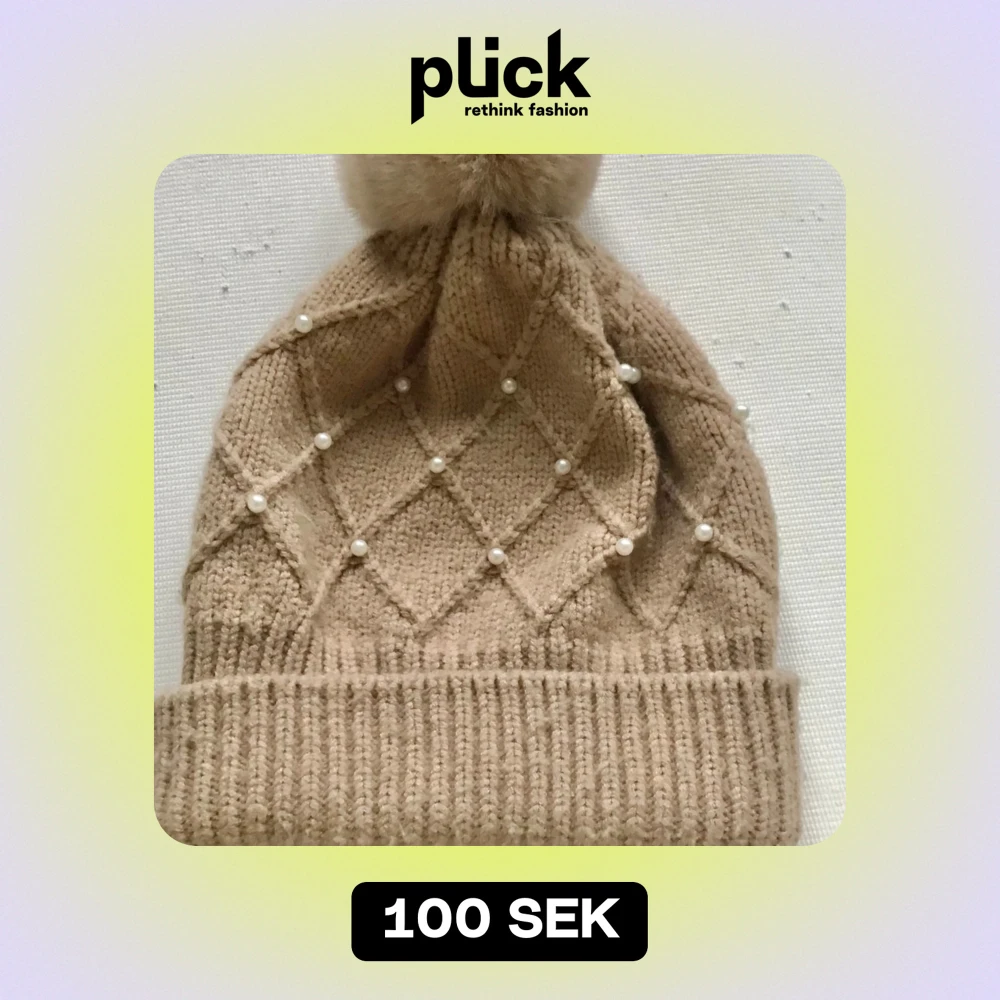 Superfin beige stickad mössa med en fluffig boll på toppen. Den har ett snyggt rutmönster dekorerat med pärlor som ger en lyxig känsla. Perfekt för kalla vinterdagar och höstpromenader. Håller dig varm och stilren!