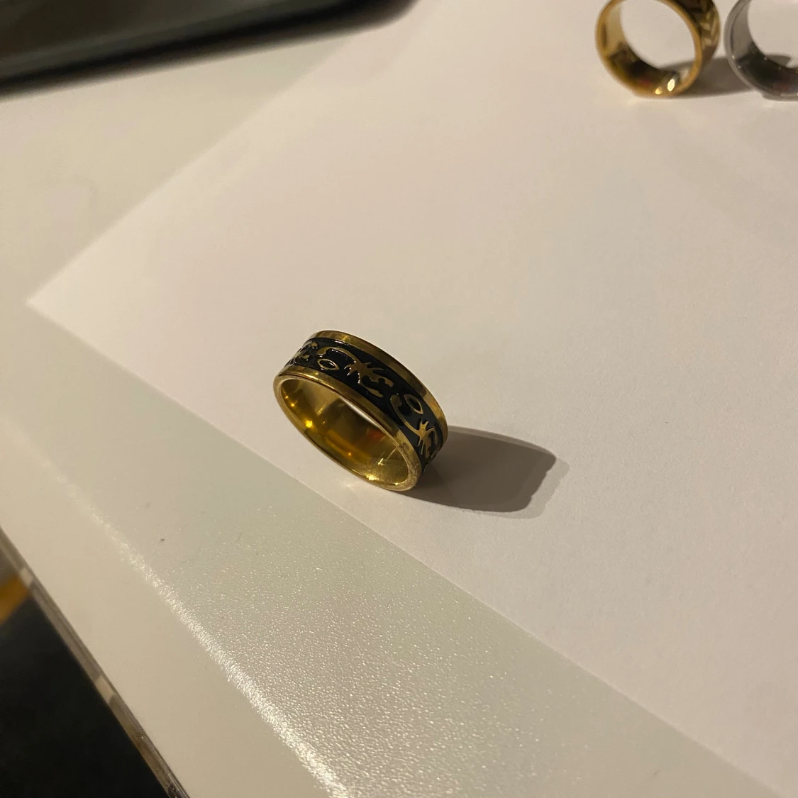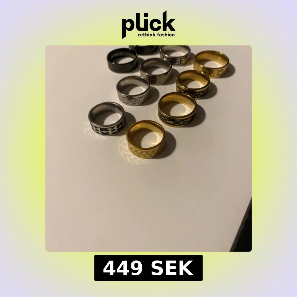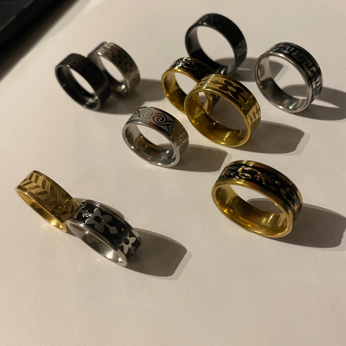 Säljer 10st breda ringar i guld- och silverfärg med coola ingraverade mönster som blommor, vågor och geometriska former. Ringarna har en snygg kontrast mellan svart, guld och silver och passar perfekt för dig som vill sticka ut med accessoarer.