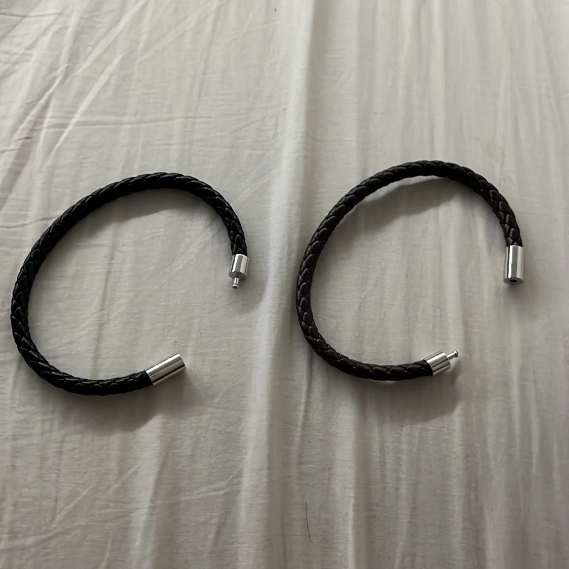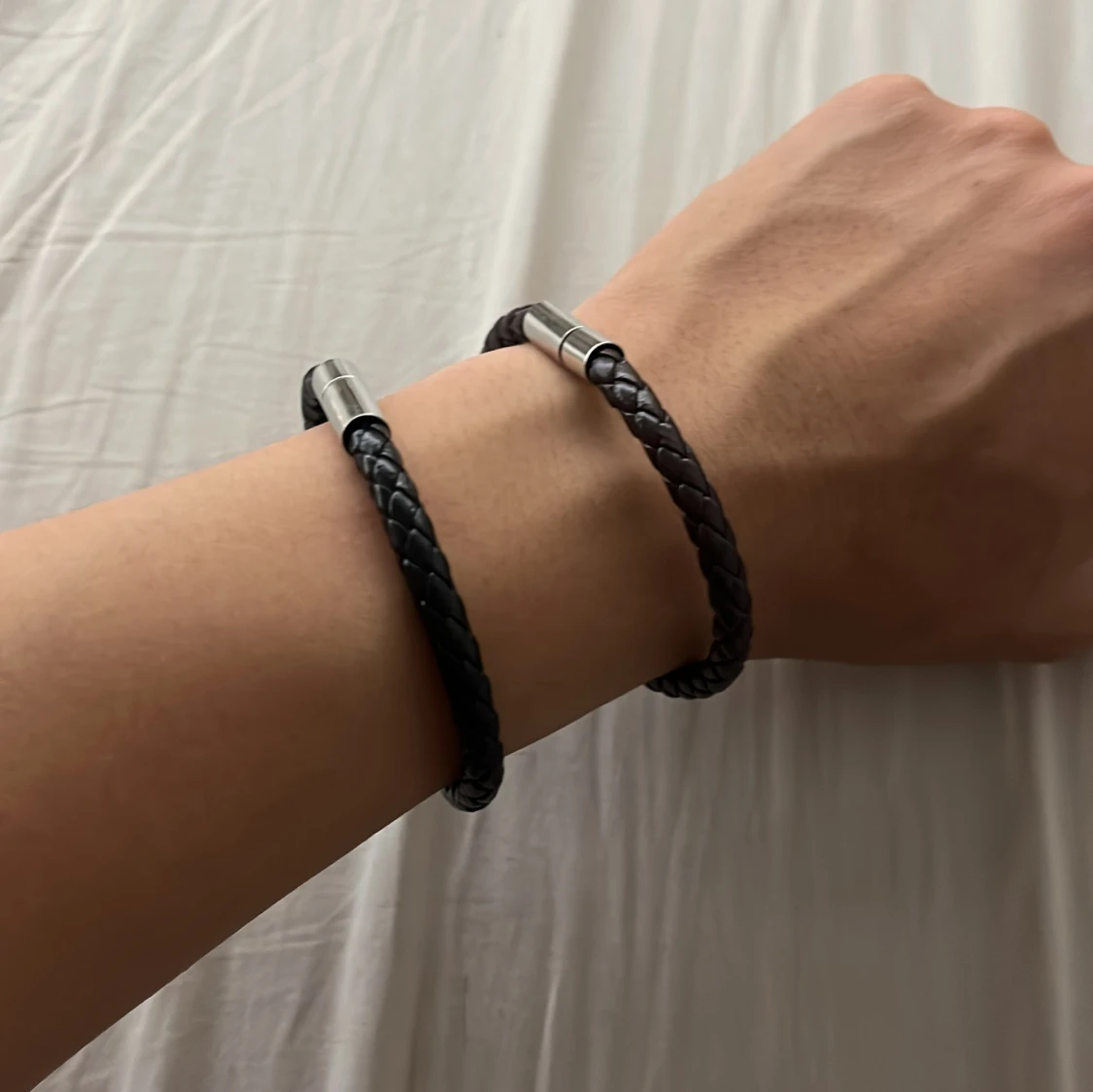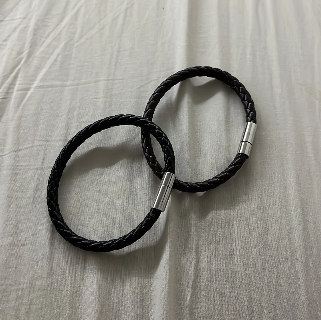 Säljer två stilrena armband i flätad design, ett svart och ett mörkbrunt. Båda har magnetlås i silverfärgad metall och passar perfekt för en enkel men snygg look. Armbanden är gjorda i konstläder och känns både lätta och bekväma på handleden.