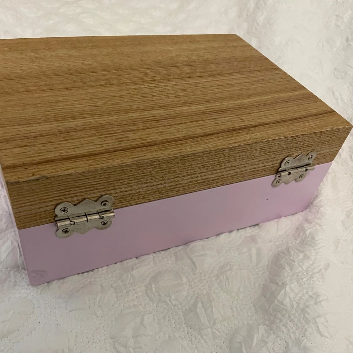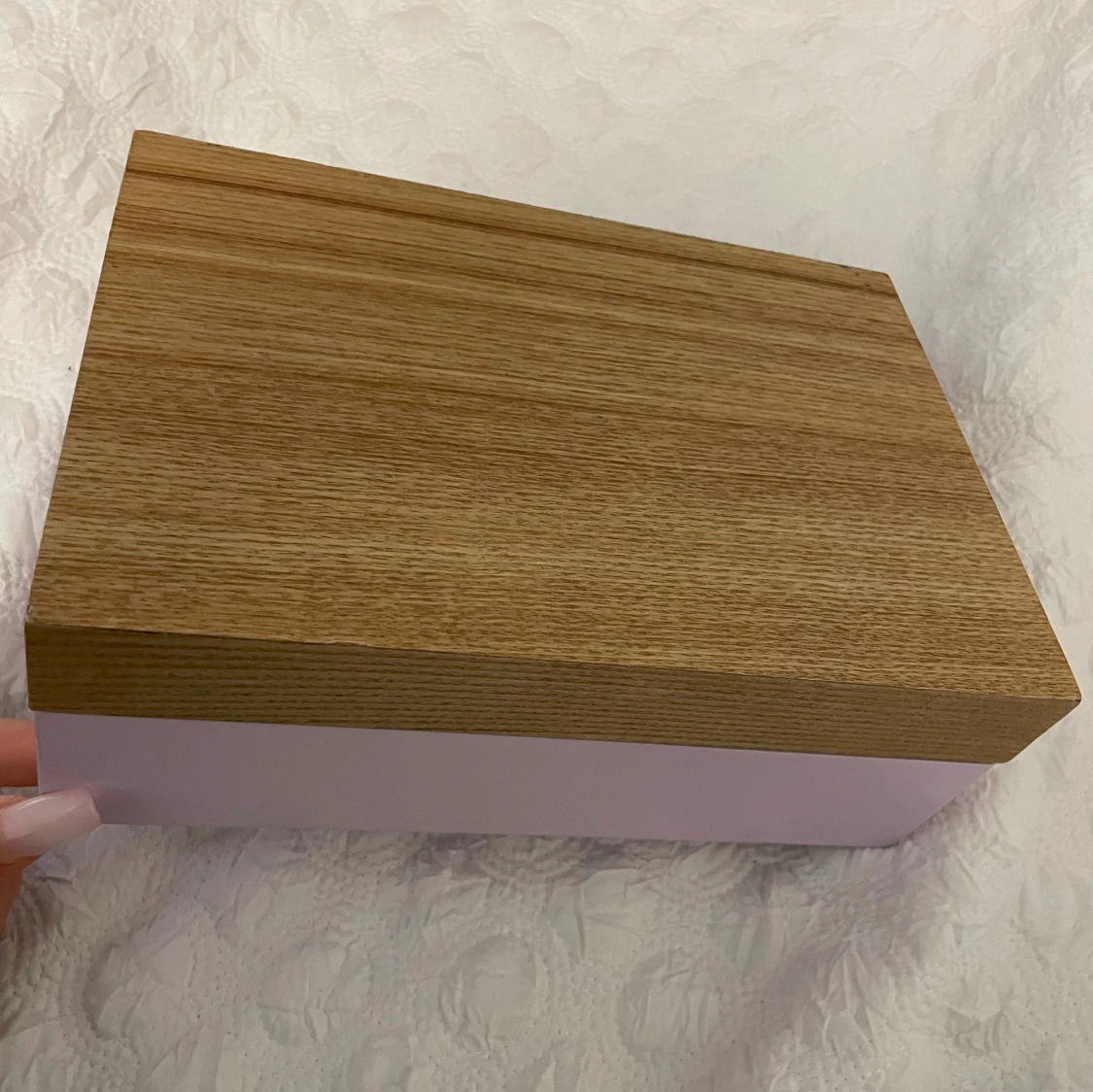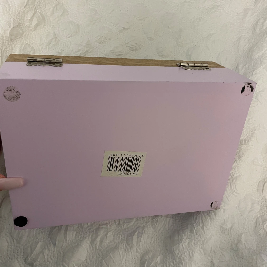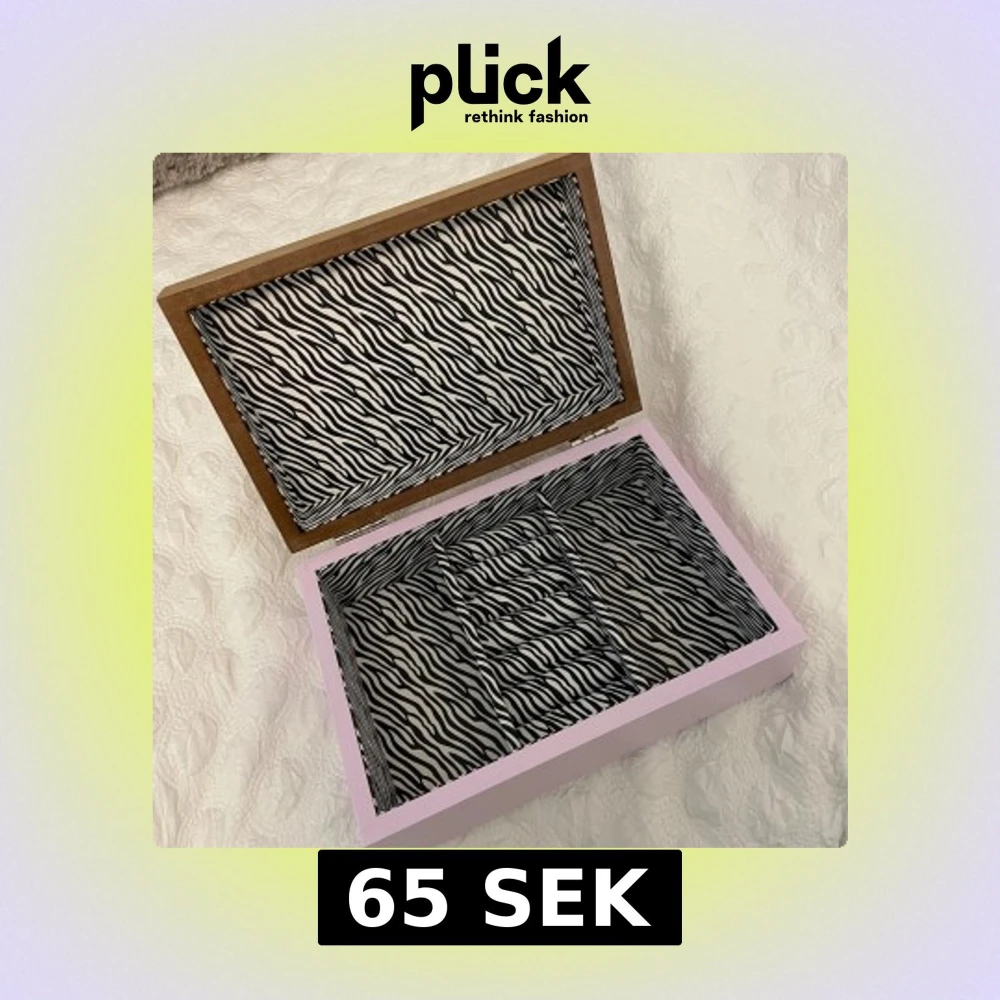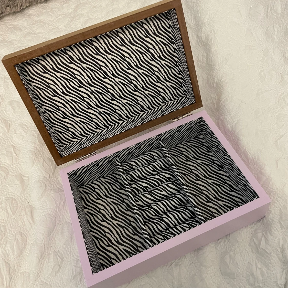 Unikt smyckeskrin med trälock och lila målad botten. Insidan är fodrad med svartvitt zebramönster och har flera fack för att organisera ringar, halsband och armband. Perfekt för att hålla dina favoritsmycken snyggt samlade.
