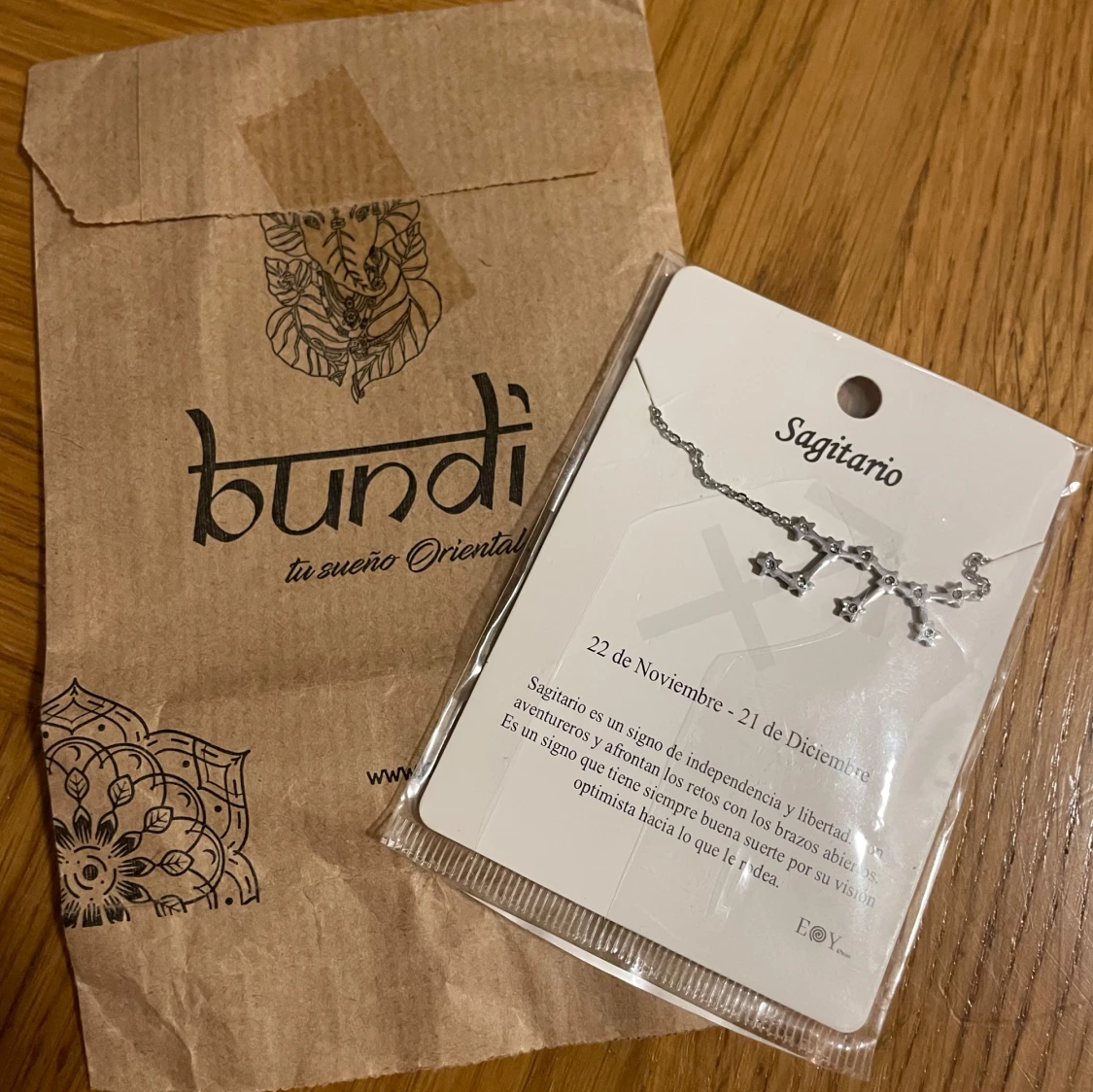 Astrologiskt halsband med stjärntecknet Skytten (Sagitario) i silverfärgat stål. Smycket har en detaljrik design med små stjärnor som formar stjärnbilden. Liten reva i förpackningen från flytten men helt ny och aldrig använd. Köpt I Spanien. Pris kan diskuteras! 🌸