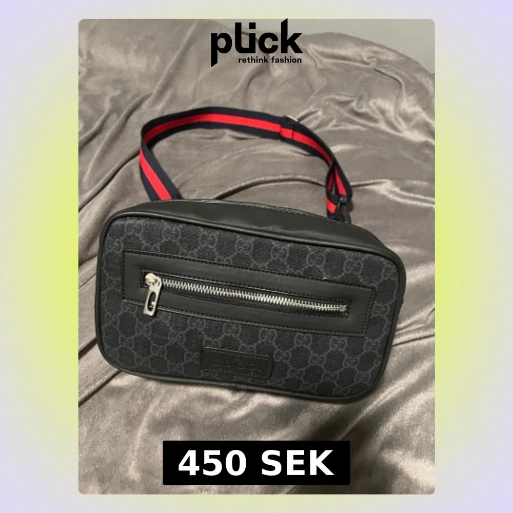 Säljer en svart axelväska med klassiskt GG-mönster och läderdetaljer. Väskan har en silverfärgad dragkedja framtill och en bred axelrem i rött och blått. Perfekt för dig som vill ha en stilren och trendig väska.