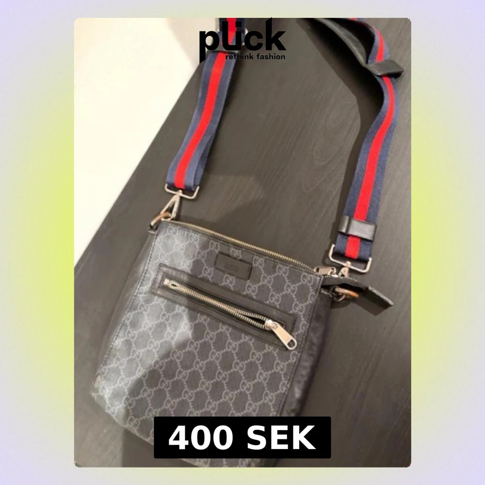 Snygg svart axelväska från Gucci med klassiskt GG-mönster över hela väskan. Väskan har en justerbar axelrem i blått och rött, samt en praktisk ytterficka med dragkedja. Tillverkad i canvas och läderdetaljer. Perfekt för dig som gillar streetstyle och lyx.