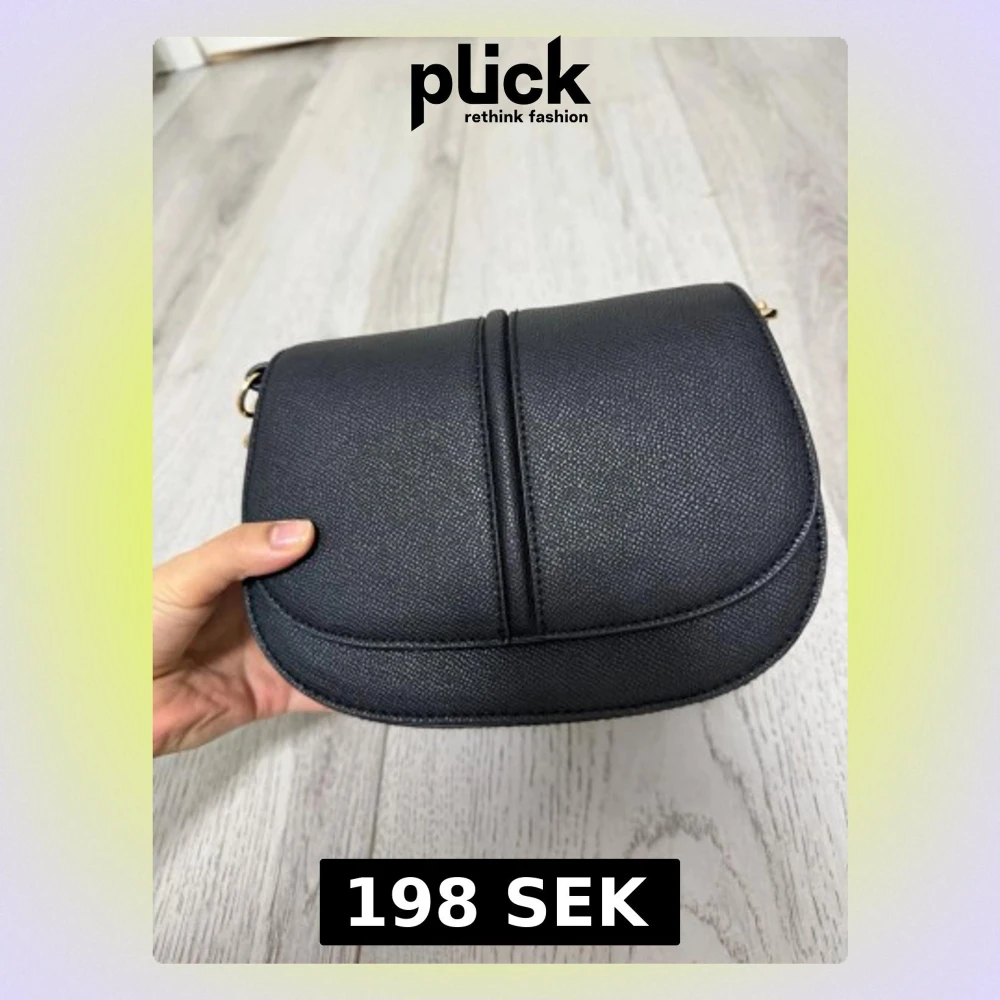 Snygg svart axelväska i konstläder med rundad form och guldfärgade detaljer. Väskan har ett stilrent och minimalistiskt utseende med en dekorativ söm på locket. Perfekt storlek för det viktigaste och enkel att matcha till olika outfits.