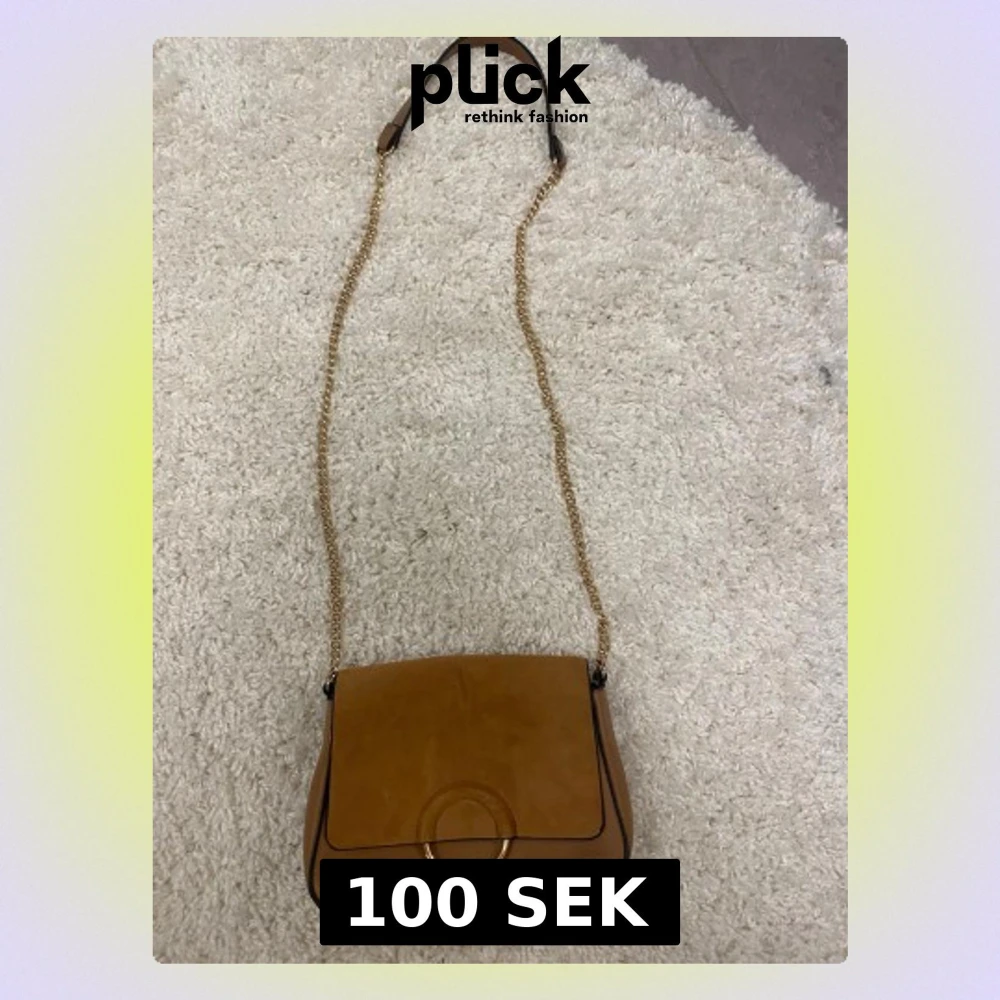 Snygg axelväska i brunt läder med guldkedja och justerbar axelrem. Väskan har en rund detalj på framsidan och lock i mocka-look.