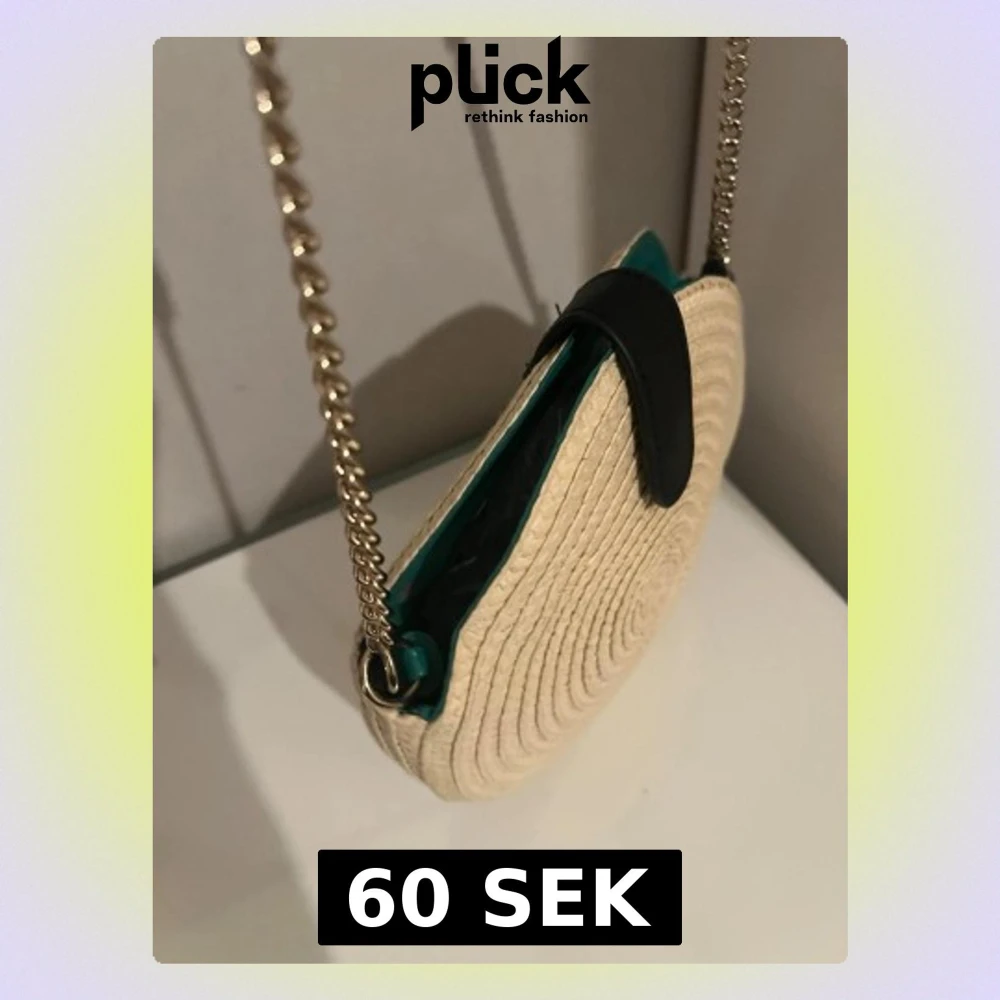 Säljer en rund axelväska i naturfärgat stråmaterial med guldfärgad kedjerem och svart läderdetalj på locket. Väskan har en unik cirkelform och insida i grönt tyg. Perfekt för dig som vill ha en trendig accessoar med boho-vibe.