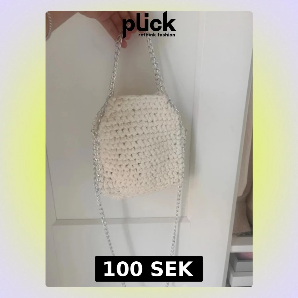 Säljer en handvirkad axelväska i krämvit färg med grovstickad struktur.