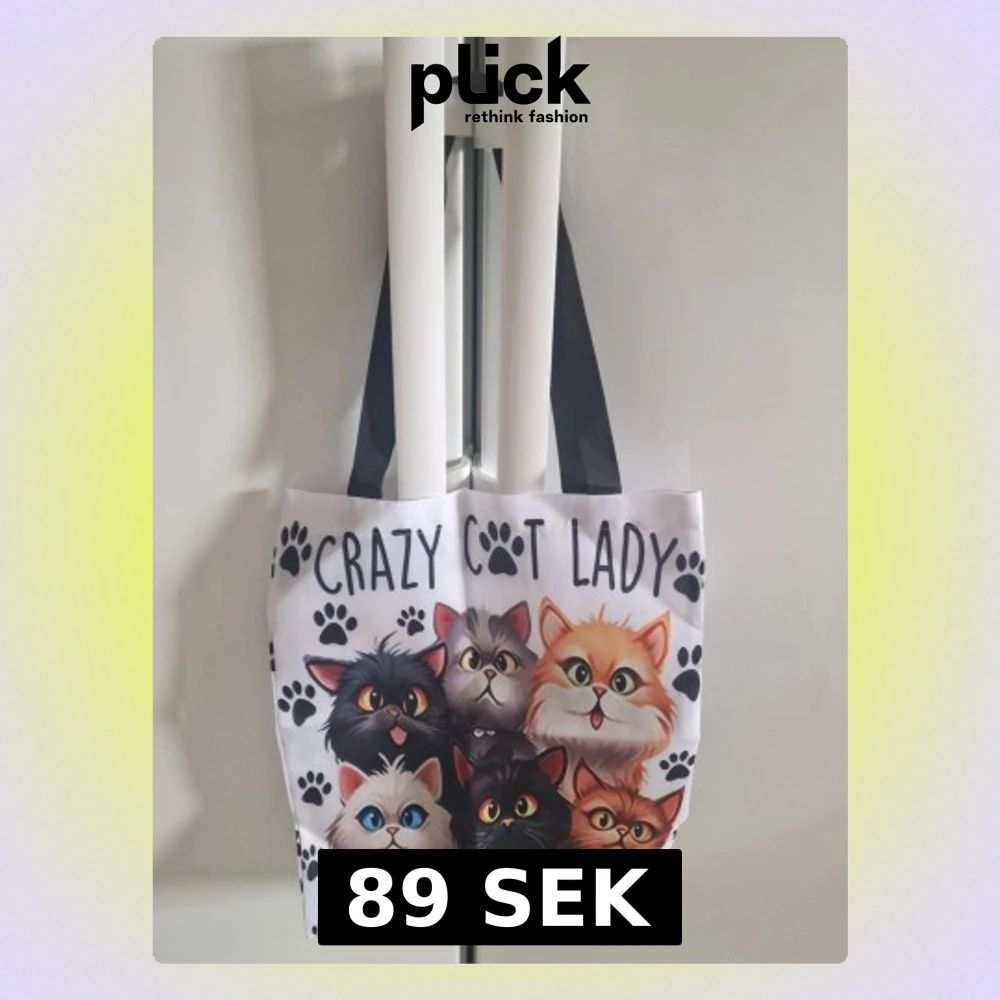 Tygväska för kvinna. Väskan är tillverkad i canvastyg och har tryck med flera katter och texten "Crazy Cat Lady" på framsidan och baksidan. Utrustad med två axelremmar i kontrastfärg. Passar för vardagsbruk, till exempel som shoppingväska eller extra vardagsväska.