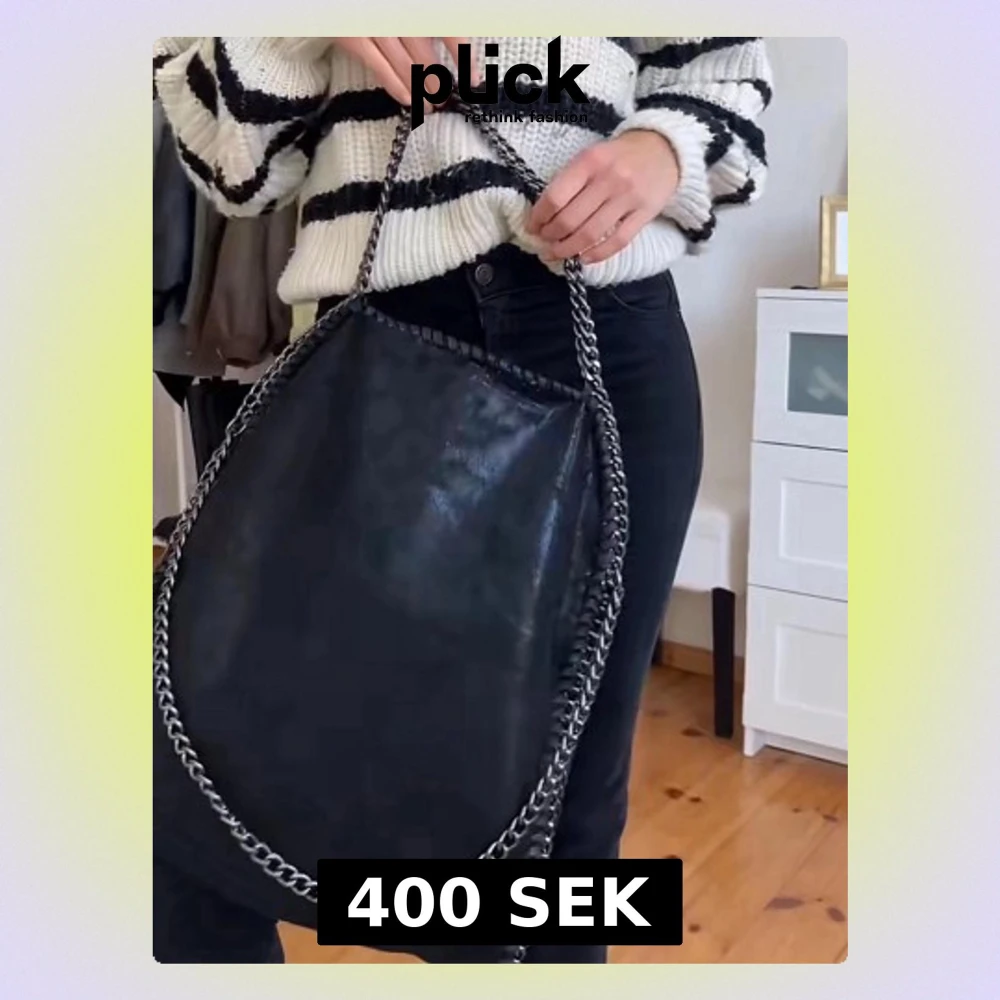 Stilren svart axelväska i glansigt material med kraftiga silverfärgade kedjor som handtag och kantdetalj. Väskan har en mjuk, slouchy form och rymmer mycket. Perfekt för dig som gillar en edgy och trendig look.Inte äkta ❤️