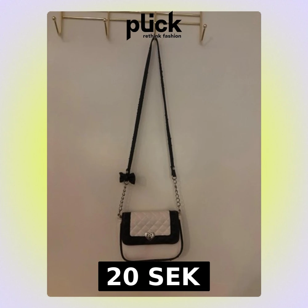 Cool axelväska i svart och vitt med quiltad framsida och silverfärgad kedja. Väskan har en dekorativ svart rosett på axelbandet och ett snyggt vridlås framtill. Materialet ser ut att vara konstläder och väskan har en rektangulär form.