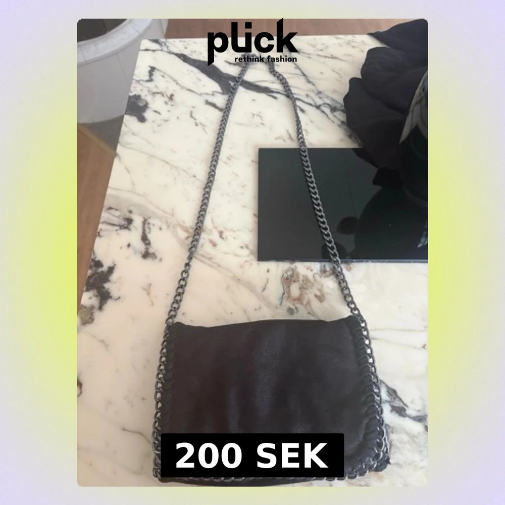 Säljer en svart axelväska med lång kedja. Väskan har magnetlås och är gjord i ett glansigt material.