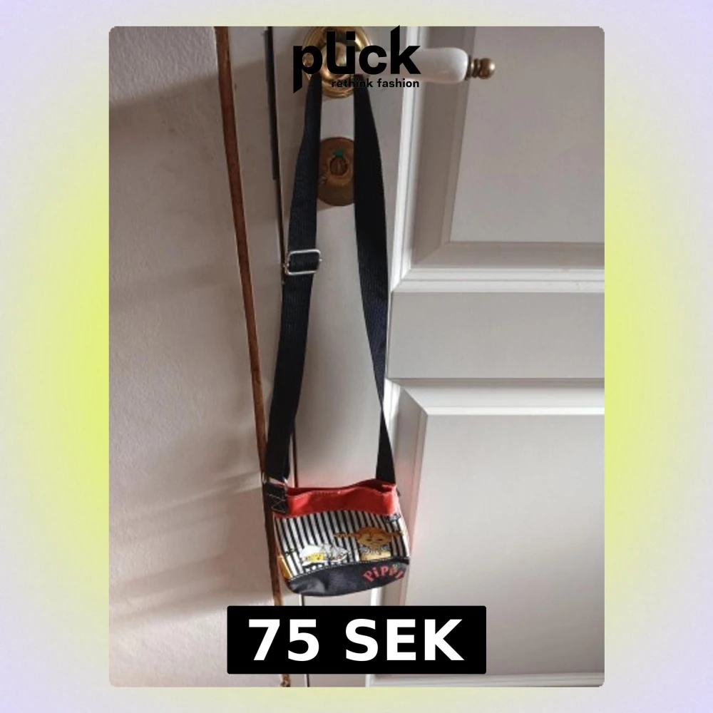 Säljer en liten axelväska med motiv av Pippi Långstrump. Väskan har svart axelrem, röd kant upptill och svart botten. Framsidan har svartvita ränder och färgglatt tryck med Pippi och hennes båt. Materialet är slitstark textil, perfekt för dig som gillar Pippi!