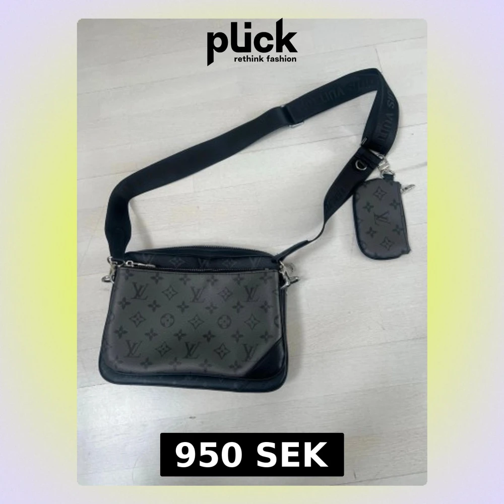Snygg axelväska i svart och grått med klassiskt monogrammönster. Väskan har justerbar bred axelrem och en liten avtagbar ficka. Tillverkad i canvas med läderdetaljer och silverfärgade metalldetaljer.