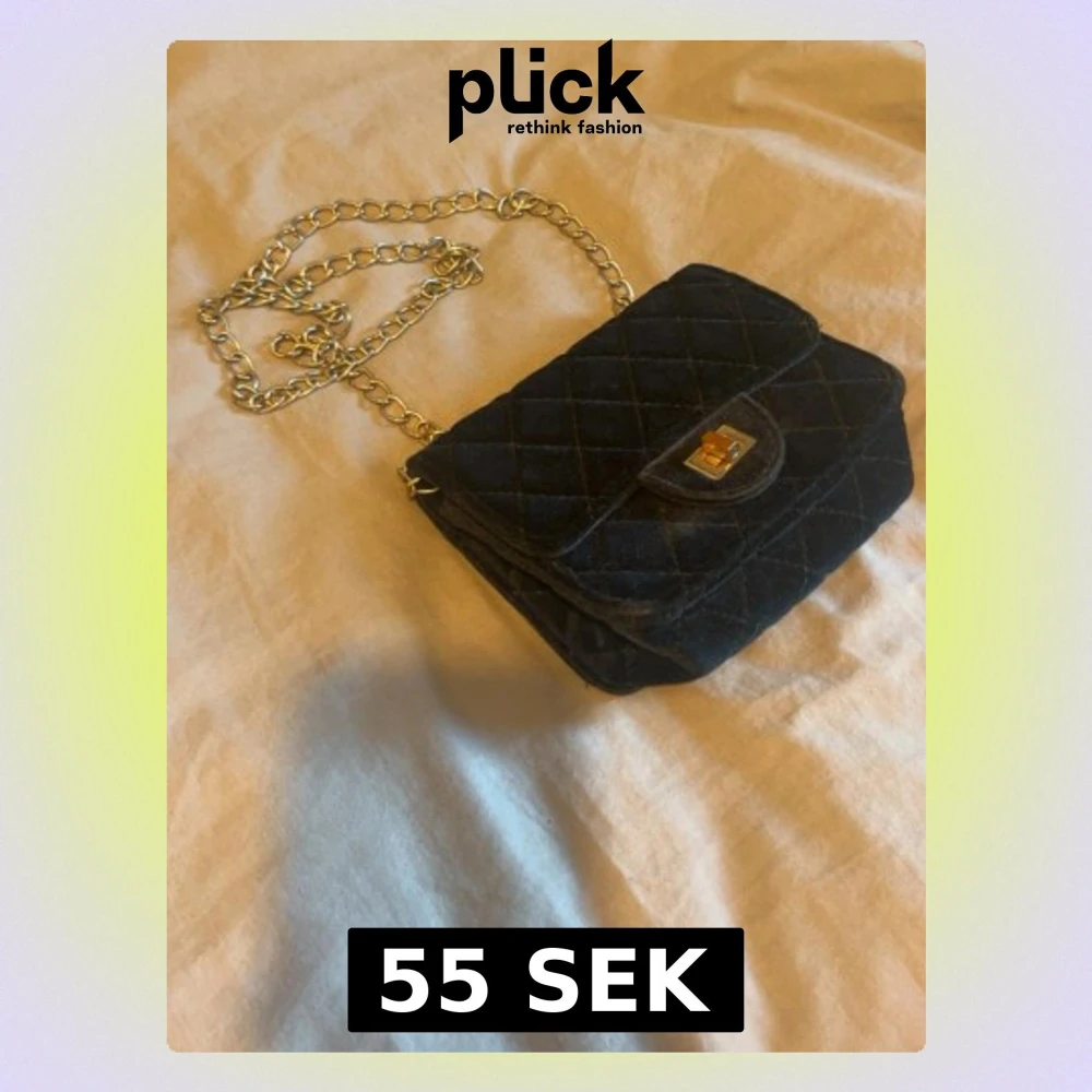Säljer en svart axelväska med guldfärgad kedjerem och snyggt vridlås framtill. Väskan har en klassisk rektangulär form och är tillverkad i ett mjukt tygmaterial. Perfekt för dig som gillar stilrena accessoarer med en lyxig touch.