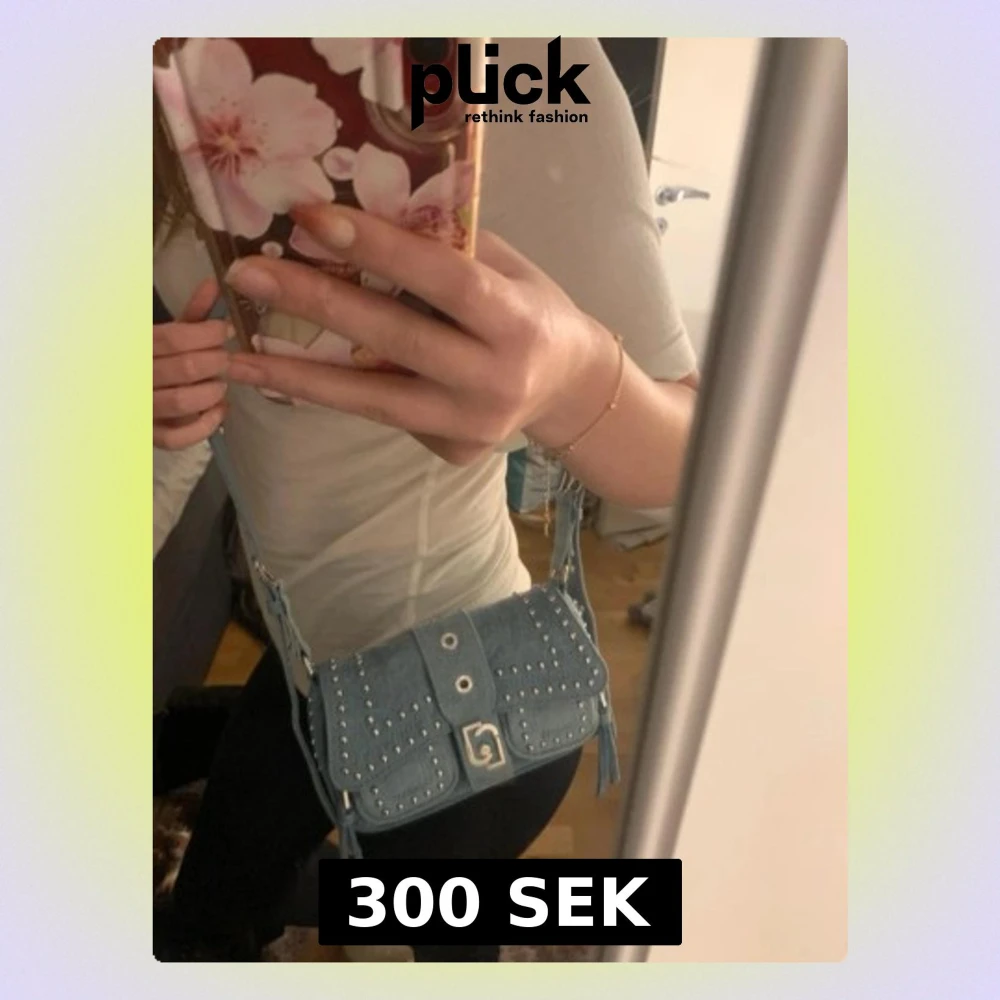Trendig ljusblå 2000-tals axelväska i jeansmaterial med silverfärgade nitar och justerbar rem. Väskan har en cool spänndetalj framtill och dekorativa fransar på sidorna. Perfekt för dig som gillar en edgy och unik stil. Köpt för lite mer än 1000kr utomlands men kom aldrig till användning därav säljare jag billigt. Den har inga tecken på skada/fläckar. Pris kan diskuteras vid snabb affär!