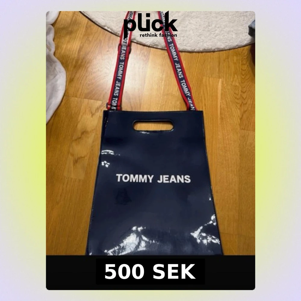 Snygg mörkblå axelväska från Tommy Jeans i glansigt material. Väskan har ett coolt tryck med loggan framtill och breda axelband i rött och blått med texten 'Tommy Jeans'. Praktiskt handtag upptill för olika sätt att bära.