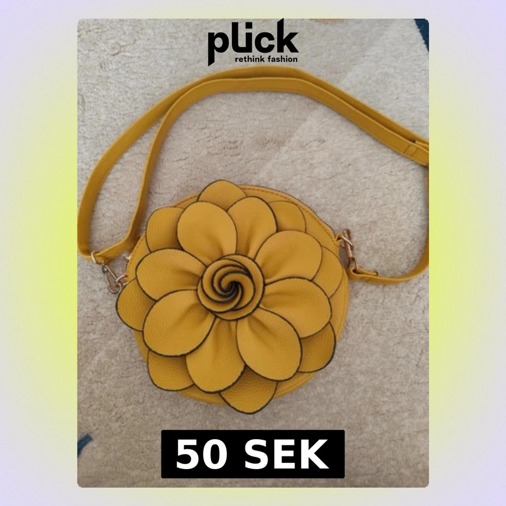 Säljer en rund axelväska i gul konstläder med en stor blomma på framsidan. Väskan har justerbar axelrem och en liten dragkedjeficka på baksidan. Perfekt för dig som vill sticka ut med en unik accessoar.