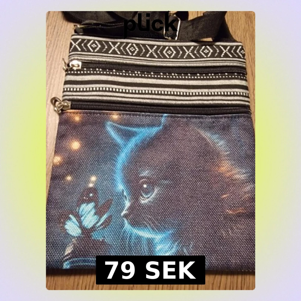 Säljer en svart axelväska i tyg med justerbar rem. Framsidan har ett tryck av en blåglödande katt och en fjäril, medan baksidan har svartvita etnomönster. Bredd 19 cm. Höjd 23,5 cm. Väskan har två dragkedjefack framtill och är perfekt för dig som gillar unika accessoarer.