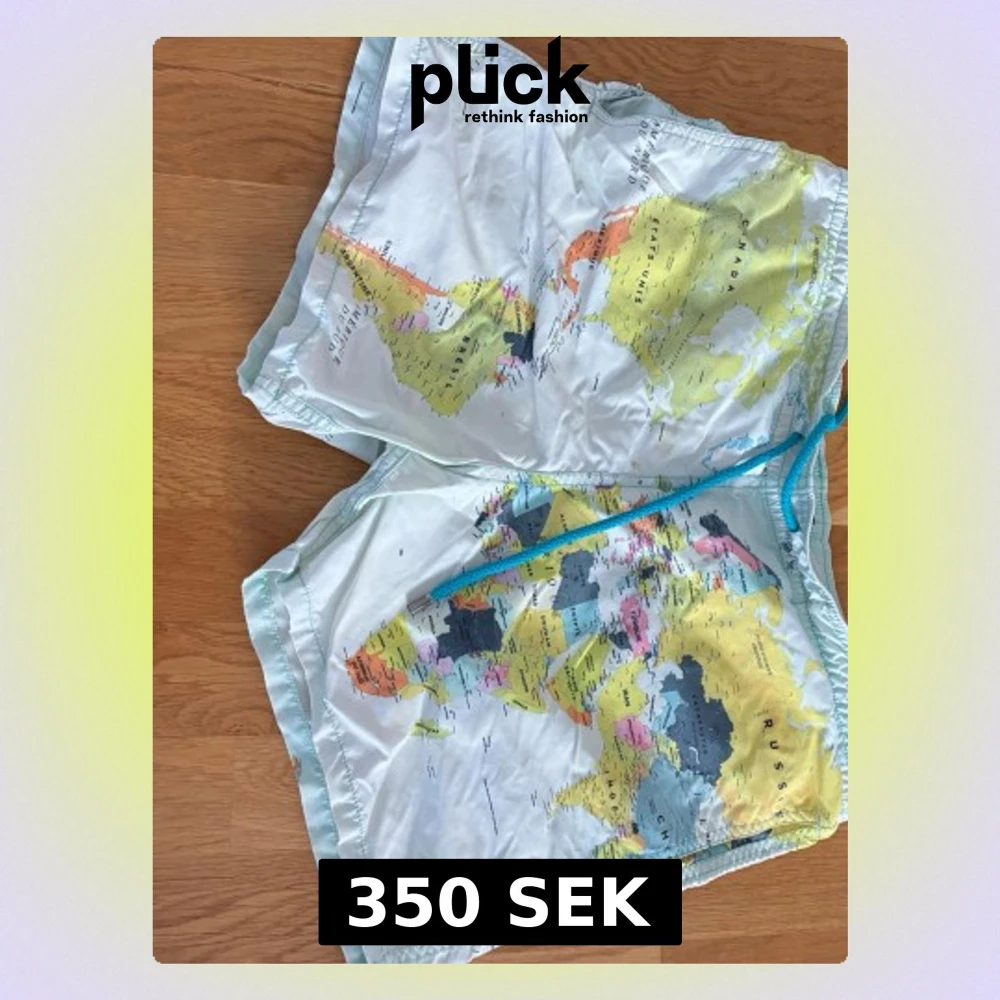 Unika badbyxor med världskarta-mönster från Vilebrequin. Färgerna är ljusblå, gul, orange och svart med turkost snöre i midjan. Tillverkade i lätt och snabbtorkande material med meshfoder för extra komfort. Nätet på insidan är trasigt.