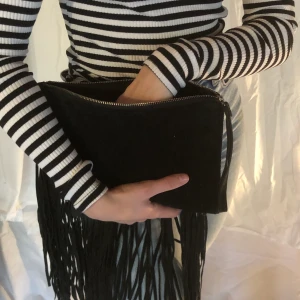 Svart handväska med fransar - 💕Kan tänka mig att gå ner i pris💕 Super snygg väska med fransar,man kan hålla i den eller ha ett band runt så de blir en axelväska.Den har fått en liten skada på ena sidan.