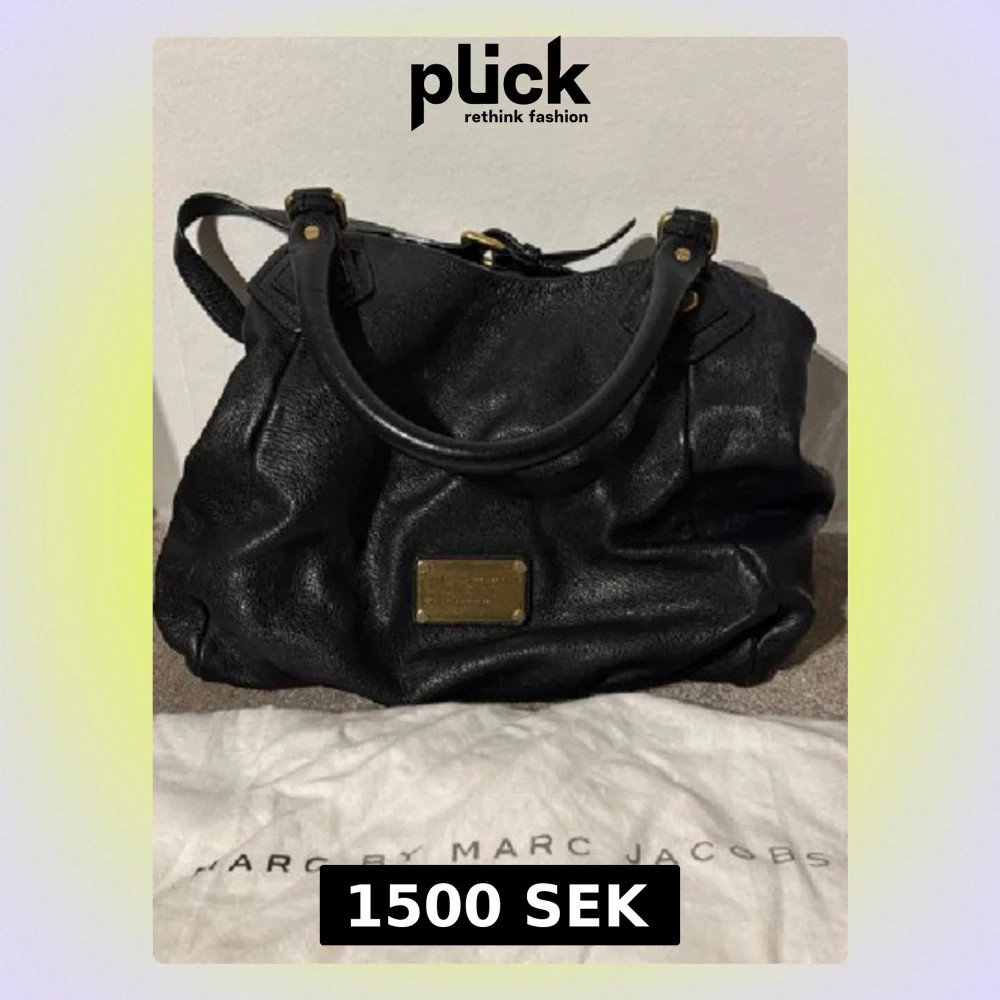 Snygg svart handväska från Marc by Marc Jacobs i mjukt skinn med guldfärgade metalldetaljer och klassisk logoplatta framtill. Väskan har dubbla handtag och en rymlig form som gör den perfekt för att bära med sig allt man behöver. En tidlös och trendig accessoar.