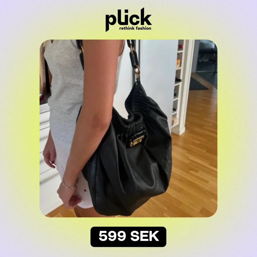 Säljer min handväska från Marc Jacobs som jag ärvt av min mamma. Den är i 100% äkta skinn, perfekt skolväska eller vardagsväska. Den är rymlig med en liten innerficka, helt svart med gulddetaljer. Inuti är den röd med pussmunnar.