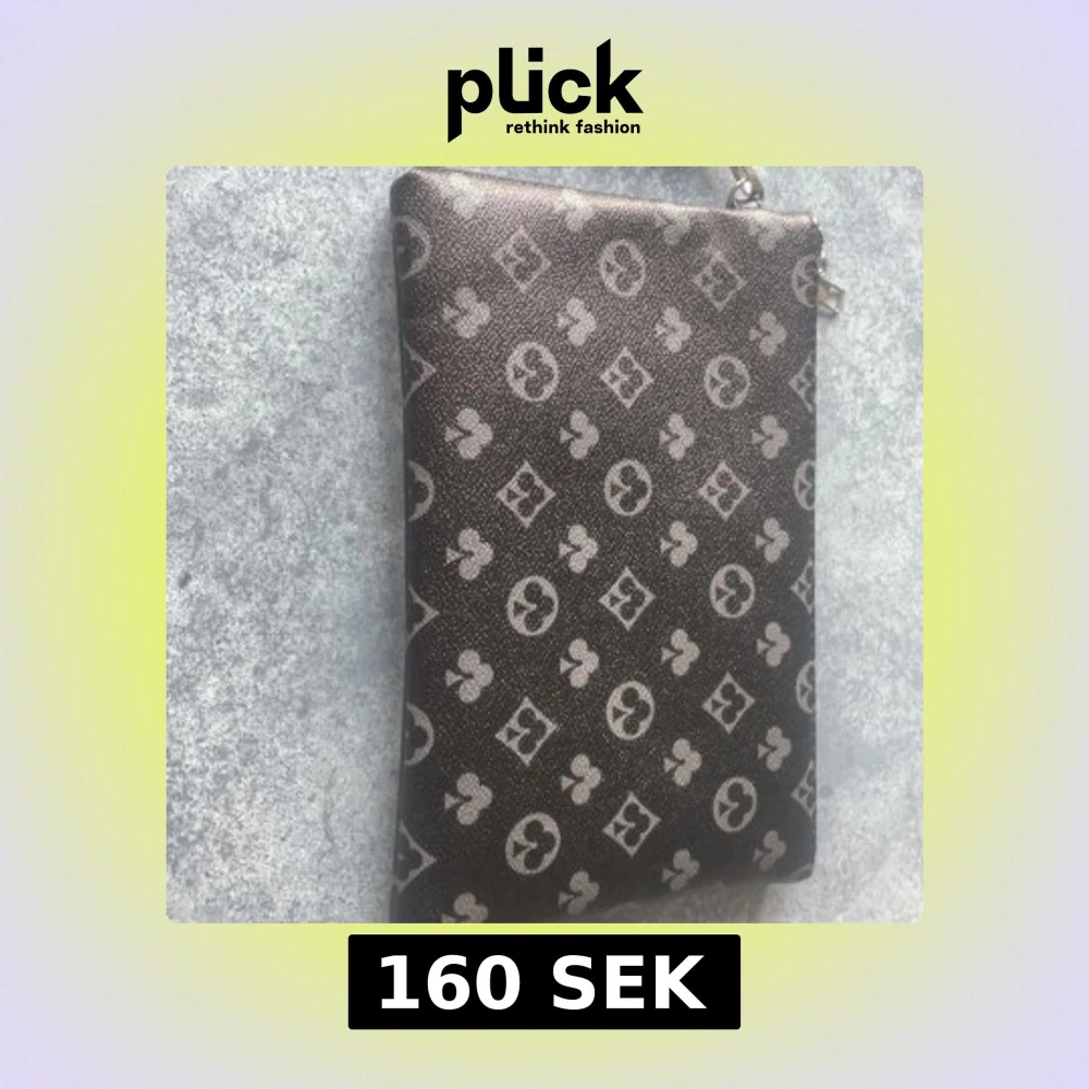 Snygg svart kuvertväska med silverfärgad dragkedja och klassiskt monogrammönster i grått. Väskan är rektangulär och har en avtagbar handledsrem. Materialet är slätt och känns som syntet eller skinn. Perfekt för att bära det viktigaste och ge din outfit en lyxig touch.