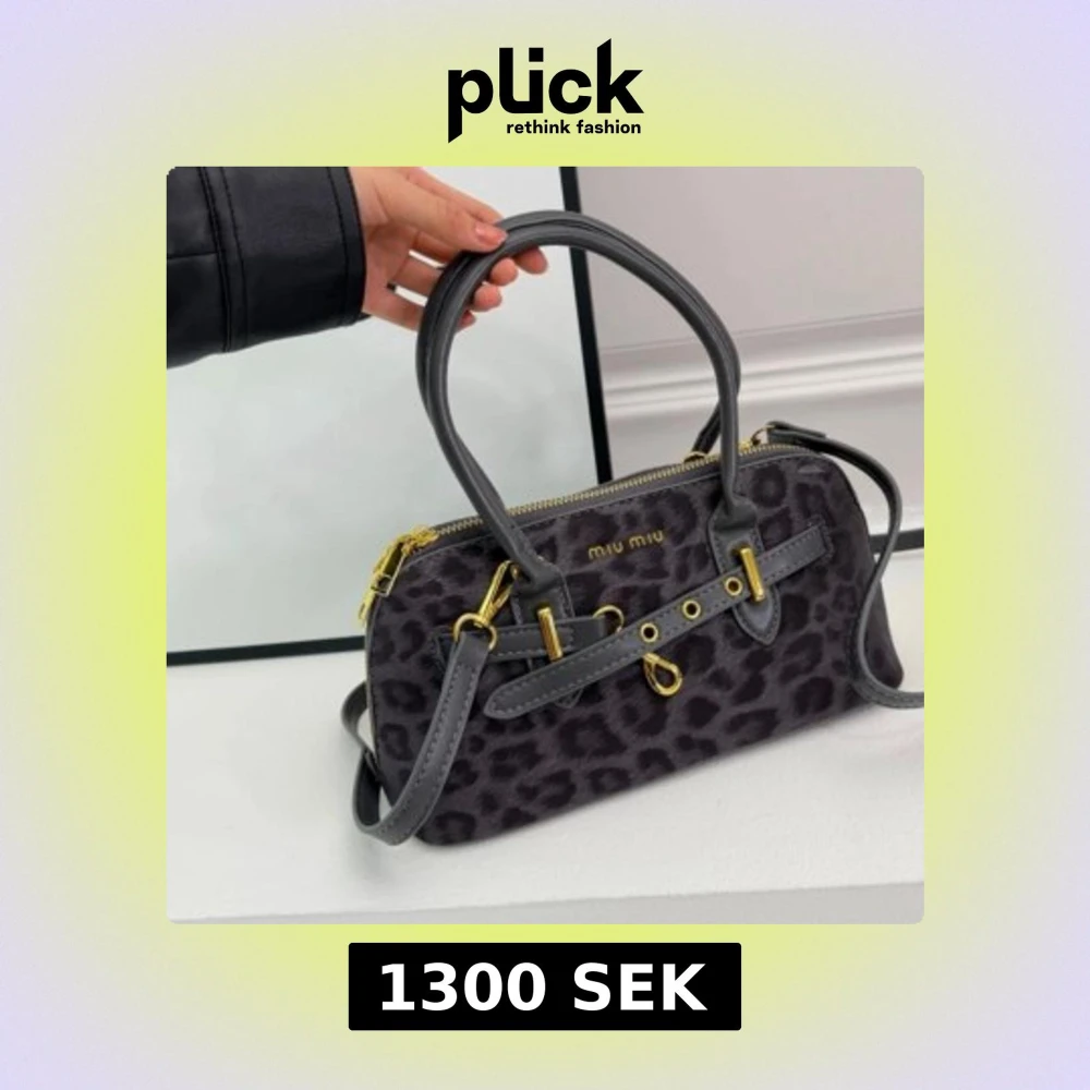 Snygg handväska från Miu Miu med leopardmönster, guldfärgade detaljer och dragkedja. Finns i svart, grått, rött och vinrött. Väskan har både handtag och axelrem, och är tillverkad i ett mjukt syntetmaterial med lyxig finish.