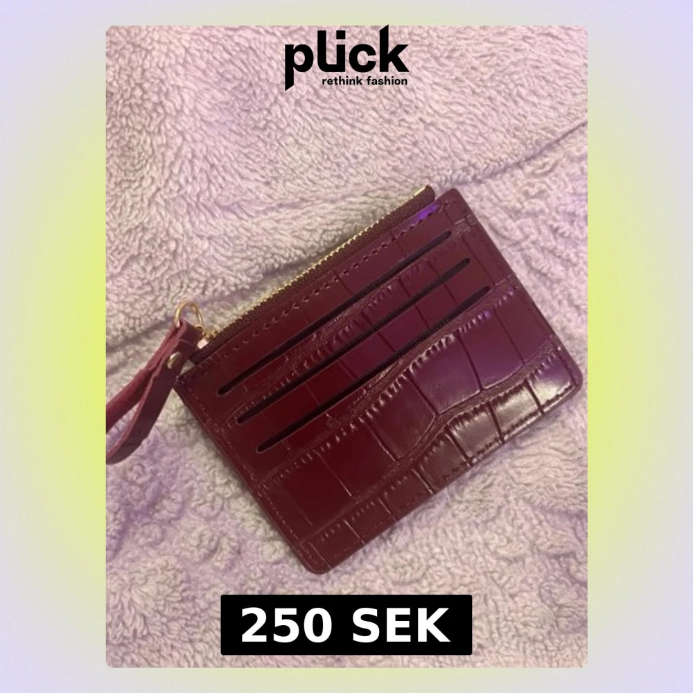 Snygg vinröd plånbok med croc-mönster och guldfärgad dragkedja. Plånboken har flera kortfack på framsidan och en handledsrem för enkel användning. Perfekt för att hålla koll på kort och kontanter i stil.