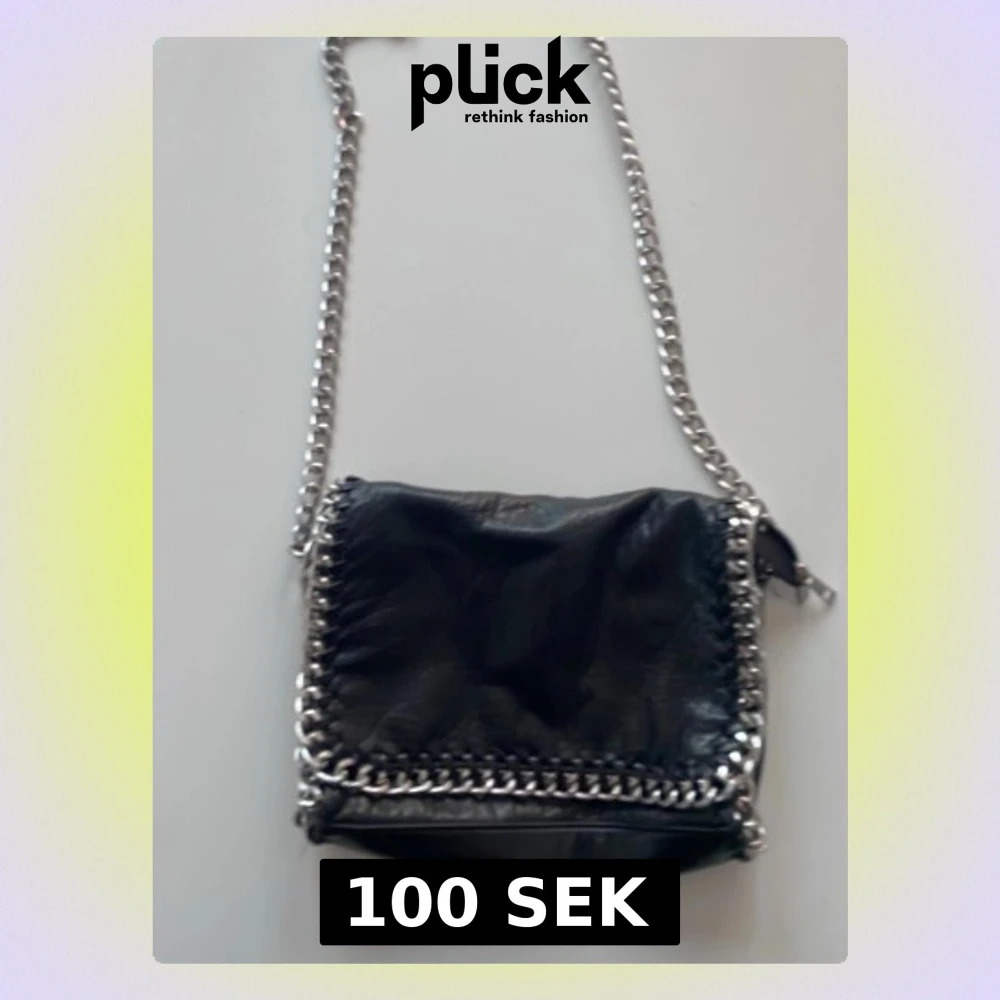 Cool svart axelväska i skinn med grova silverfärgade kedjor runt kanterna och som axelrem. Väskan har magnetknäppning och dragkedja på insidan, perfekt för att hålla koll på dina grejer. Stilren design med en edgy touch.