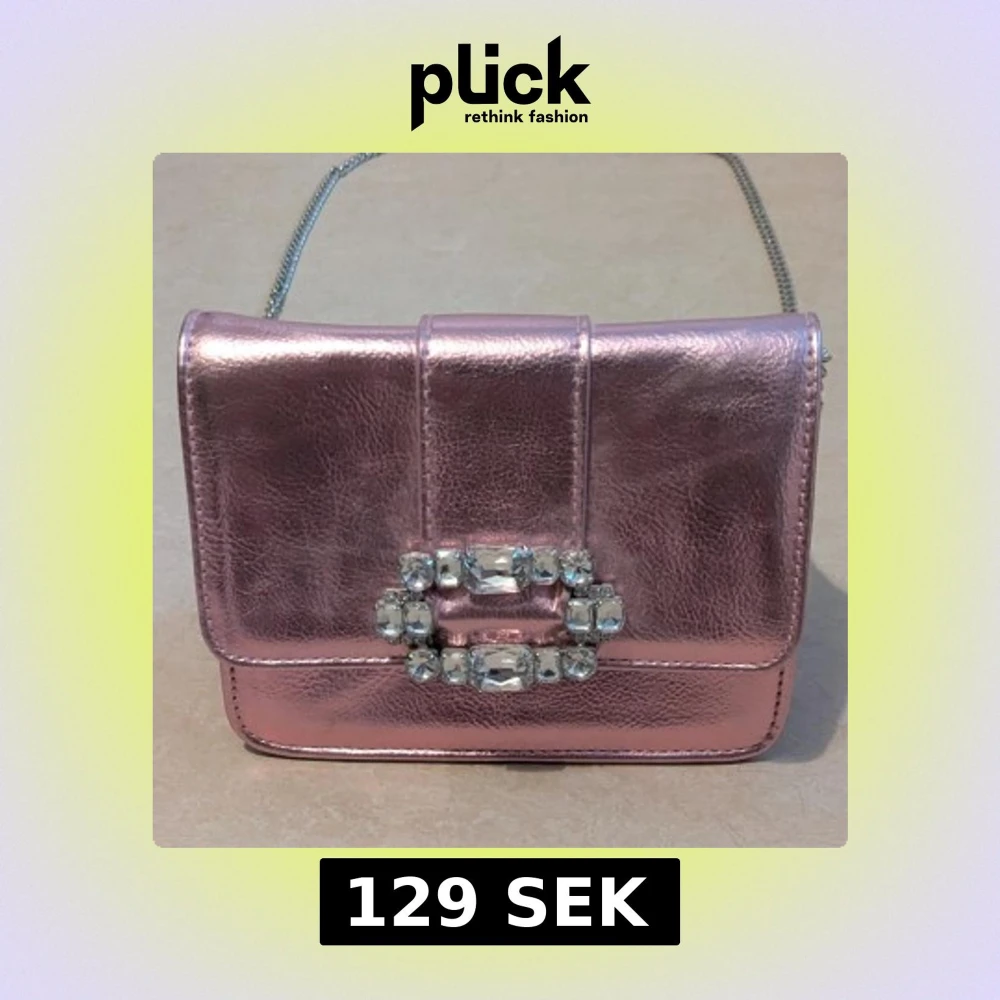 VÄSKAN ÄR HELT OANVÄND. Säljer en liten axelväska i metallicrosa med silverfärgad kedja och glittrande strassdetalj på framsidan. Väskan har magnetlås och ett huvudfack med innerficka med dragkedja. Perfekt för att lyfta vilken outfit som helst.