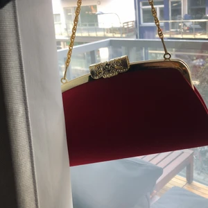 Jättefin elegant röd lite clutch/handbag, guldiga detaljer, verkligen superfin, bra skick bara lite sprucken i lädret inuti.