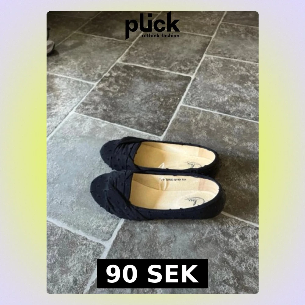 Säljer ett par svarta ballerinaskor från Vex med diskret prickig textur och dekorativa veck framtill. Skorna har en mjuk innersula och en sula med blommönster. Perfekta för dig som vill ha en enkel men ändå unik look.