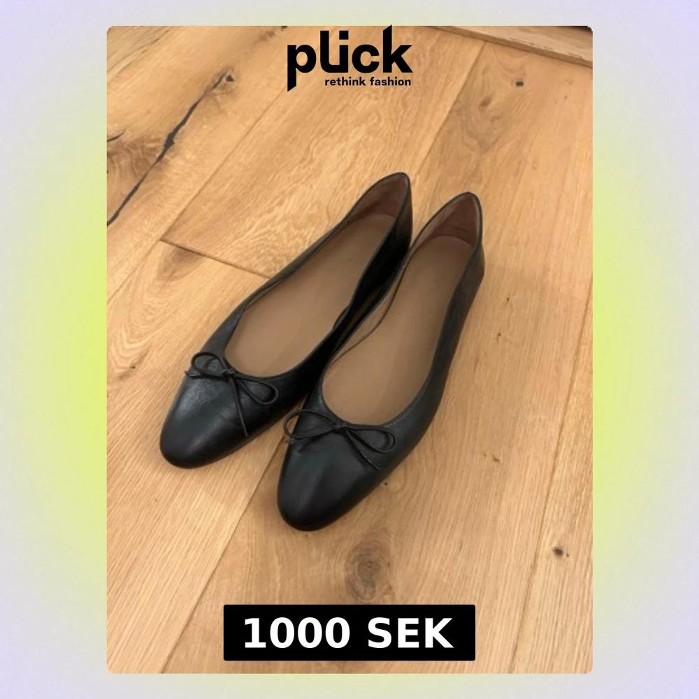 Stilrena svarta ballerinaskor i mjukt läder med klassisk rund tå och liten rosett framtill. Använda en gång men säljer då de inte passar!