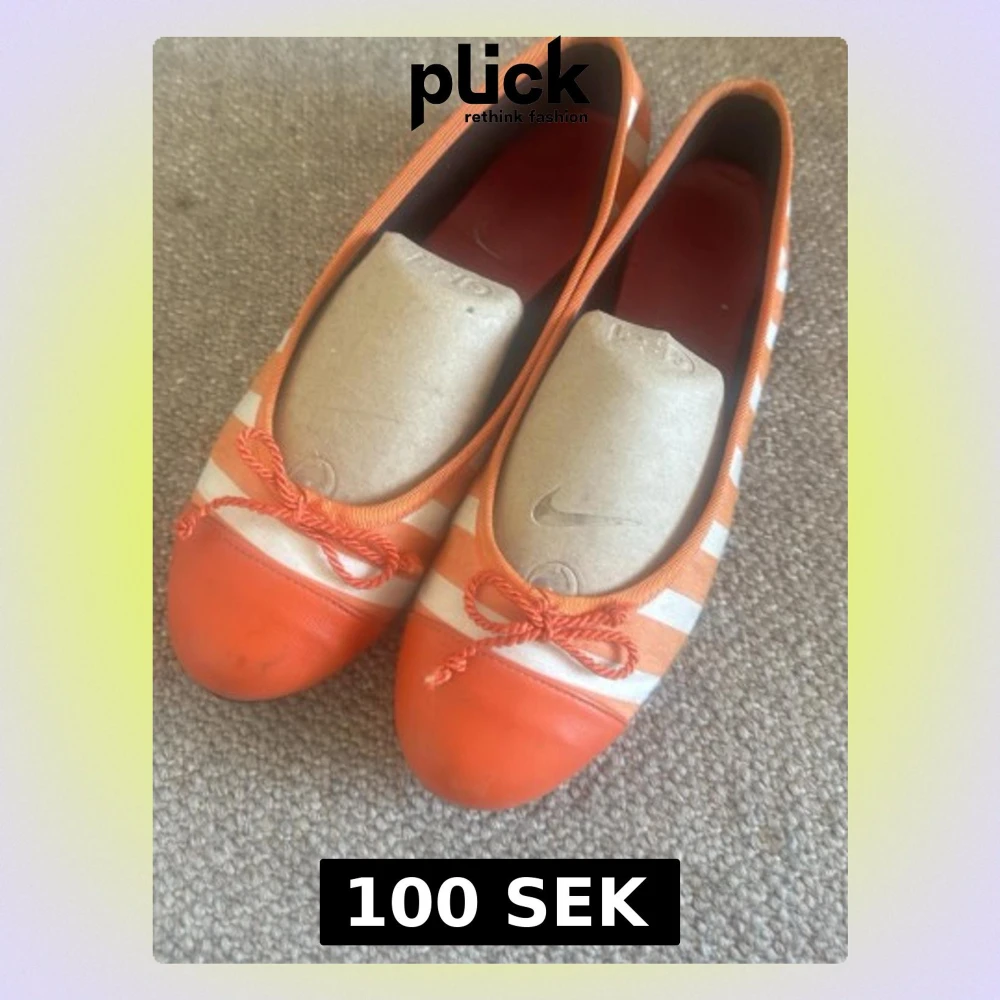 Handgjorda fina ballerinas från Kokua i orange och vitt med ränder och orange tåparti. Skorna har en dekorativ rosett framtill och röda innersulor. Perfekt för dig som gillar sportiga och färgglada skor med unik design. Köpta i Kokua butik i Barcelona. Sparsamt använda.