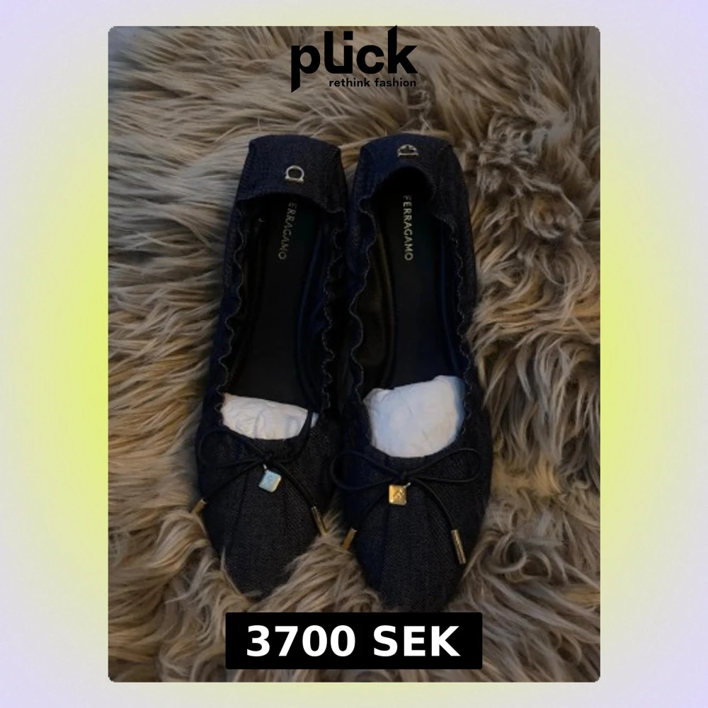 Snygga mörkblå ballerinaskor från Ferragamo i denimliknande material. Skorna har rundad tå, dekorativ rosett framtill med guldfärgade detaljer och diskret logga på hälen. Perfekta för dig som gillar en stilren och trendig look. Ej använda & inköpta för ca 5000-7000 kr.