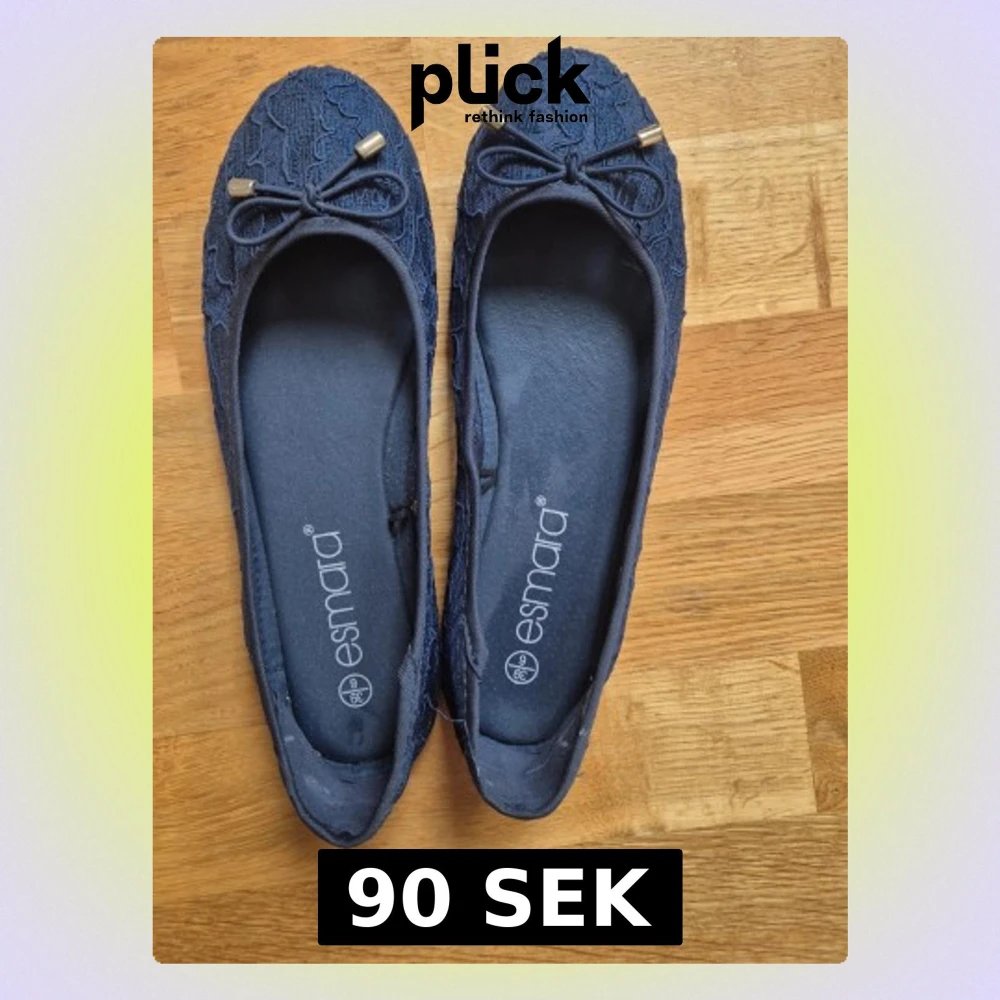 Snygga mörkblå ballerinaskor från Esmara med spetsdetaljer och dekorativa rosetter framtill. Skorna har guldfärgade metalldetaljer på rosetterna och en klassisk rundad tå. Perfekta för dig som vill ha en feminin och stilren look. OBS. Lite stora i storleken så de passar bättre för sig med stl. 39.5-40.