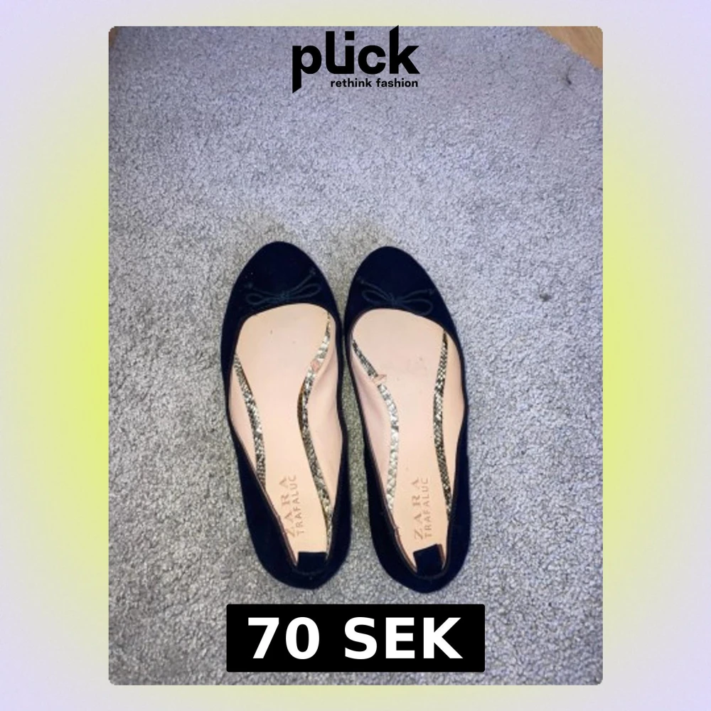 Mörkblåa ballerinaskor i storlek 37 från Zara med rosett fram. Något används men ännu i fint skick. Perfekta till sommarn!