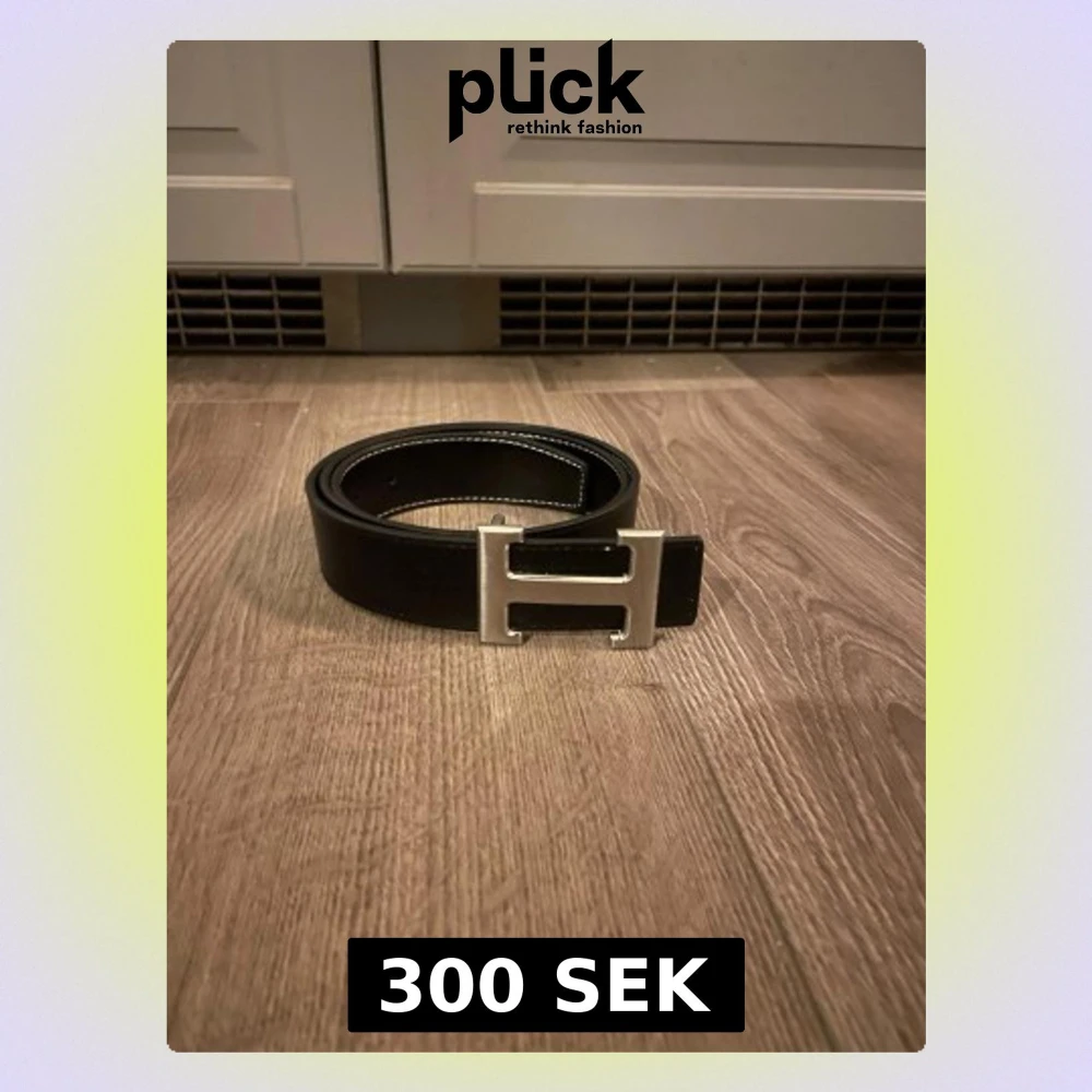 Snyggt svart bälte med ett stort H-format spänne i silverfärg. Bältet har vita sömmar längs kanterna och är gjort i skinn. Perfekt accessoar för att lyfta din outfit.