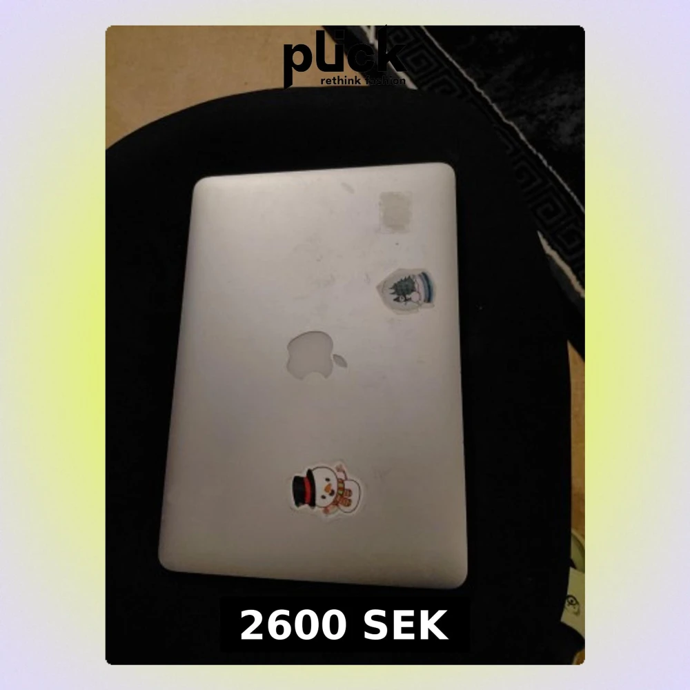 Säljer en silverfärgad MacBook från Apple med klassisk minimalistisk design i aluminium. Datorn har svart tangentbord och stor styrplatta. Utsidan är dekorerad med några klistermärken, bland annat en snögubbe. Perfekt för studier eller kreativt arbete.