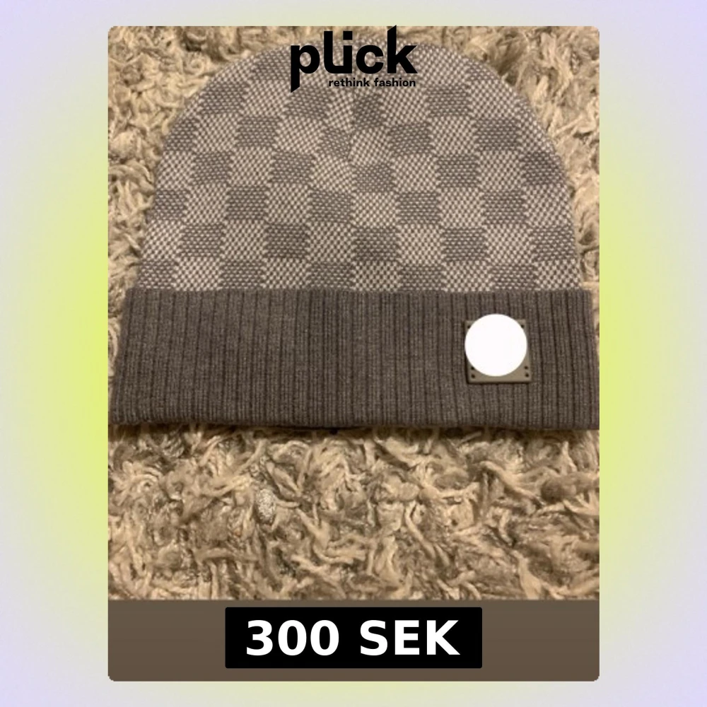Säljer en stilren grå mössa med rutmönster och vikt kant. Mössan har en ribbstickad kant och en fyrkantig patch framtill. Perfekt accessoar för kalla dagar och passar till de flesta outfits.