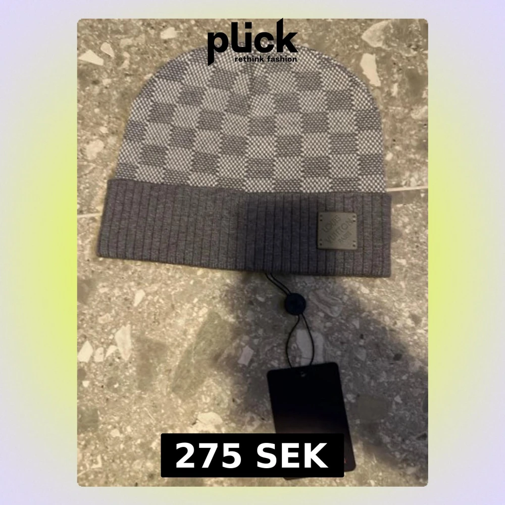Zara - Säljer en snygg grå mössa från Vuitton med klassiskt rutmönster och vikt kant. Mössan har en diskret L-logga på en patch framtill och är tillverkad i mjukt, stickat material. Perfekt accessoar för dig som gillar exklusiv och stilren design.