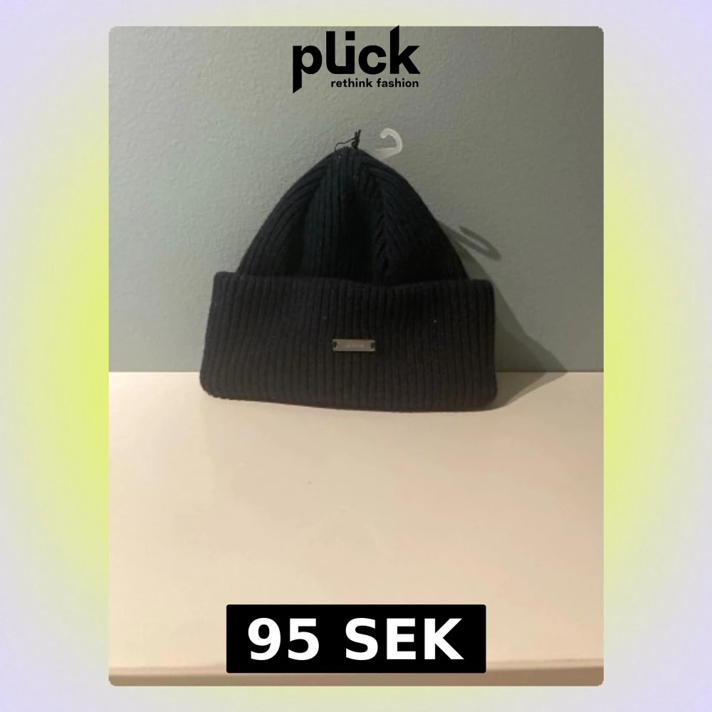 Snygg blå ribbstickad mössa från Sätila med uppvikt kant och en liten metallbricka framtill. Perfekt accessoar för kalla dagar och enkel att matcha med olika outfits.