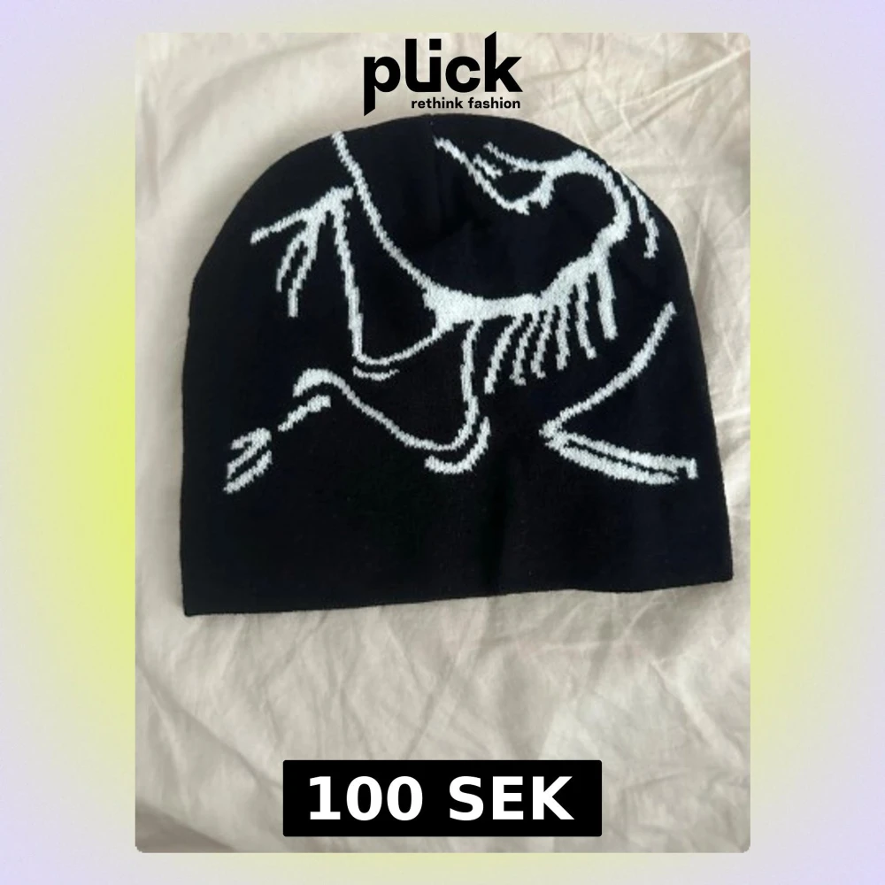 Säljer en svart mössa med ett coolt vitt dinosaurieskelett-motiv. Mössan är stickad i mjukt material och har en avslappnad passform. Perfekt för dig som vill sticka ut med en unik accessoar till hösten eller vintern.