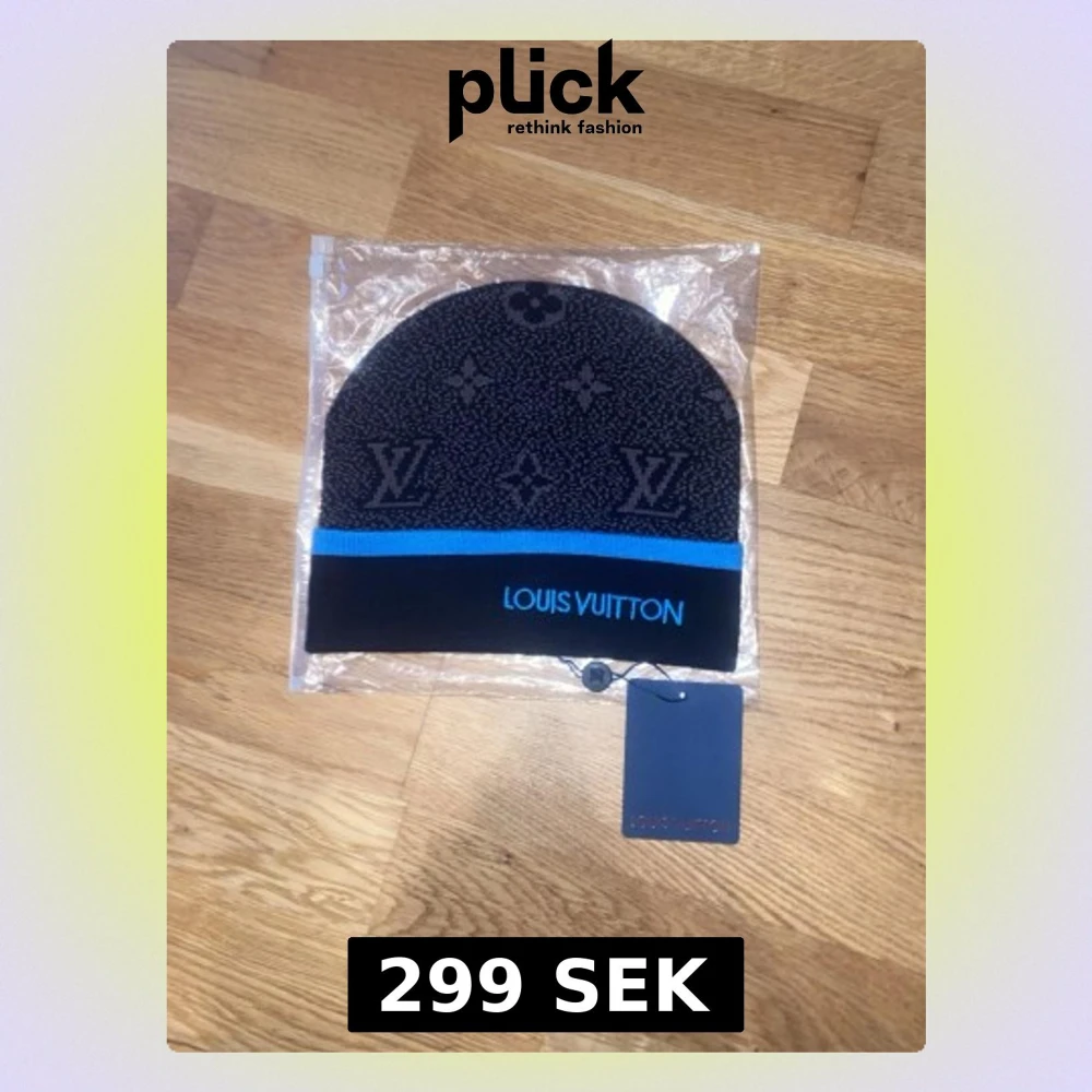 Snygg svart mössa med klassiskt monogrammönster och blå rand. Märkets logga är broderad framtill i blått. Mössan är stickad och har en modern, stilren look som passar perfekt till streetwear och modeintresserade.