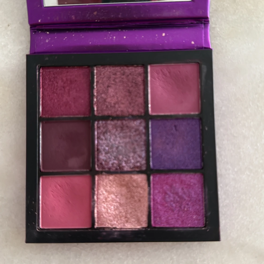 Säljer en Huda Beauty Amethyst Obsessions ögonskuggspalett med 9 nyanser i lila, rosa och vinröda toner. Paletten innehåller både matta och skimriga skuggor, perfekt för kreativa och färgstarka ögonlooks. Kompakt format med spegel i locket.